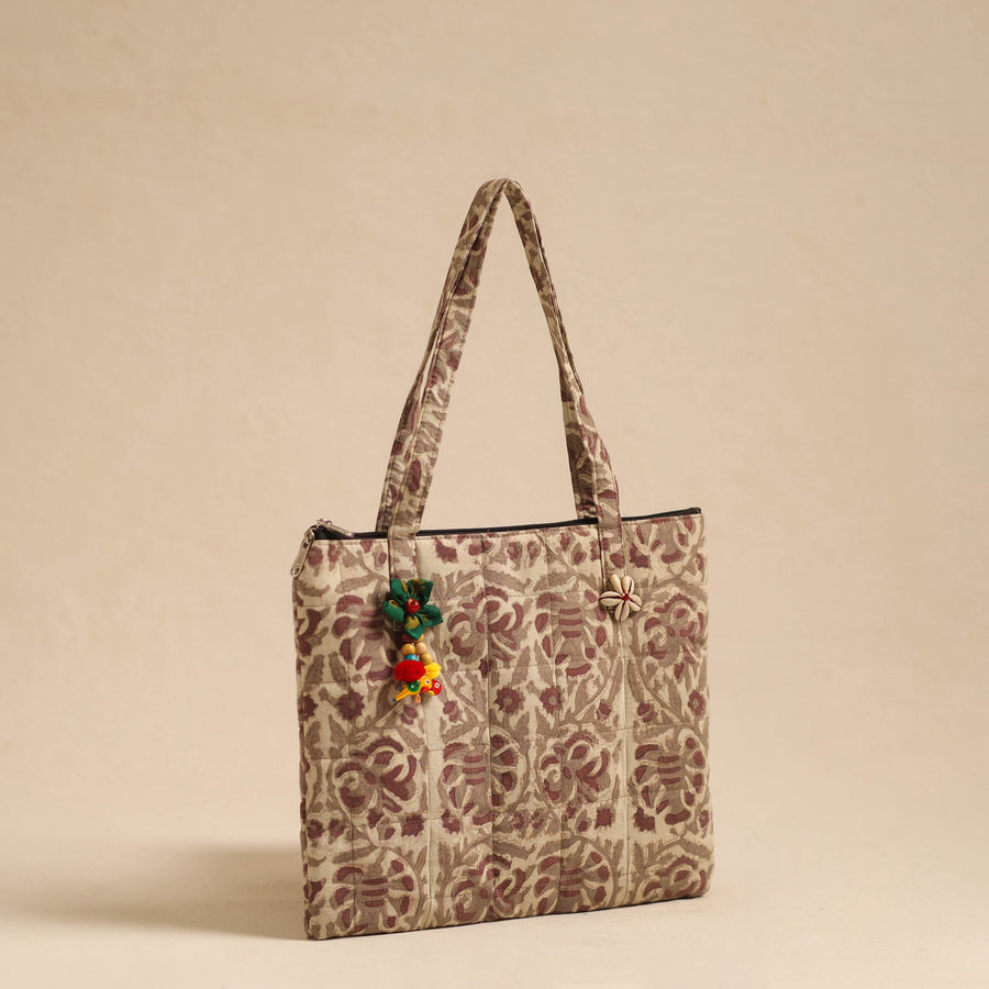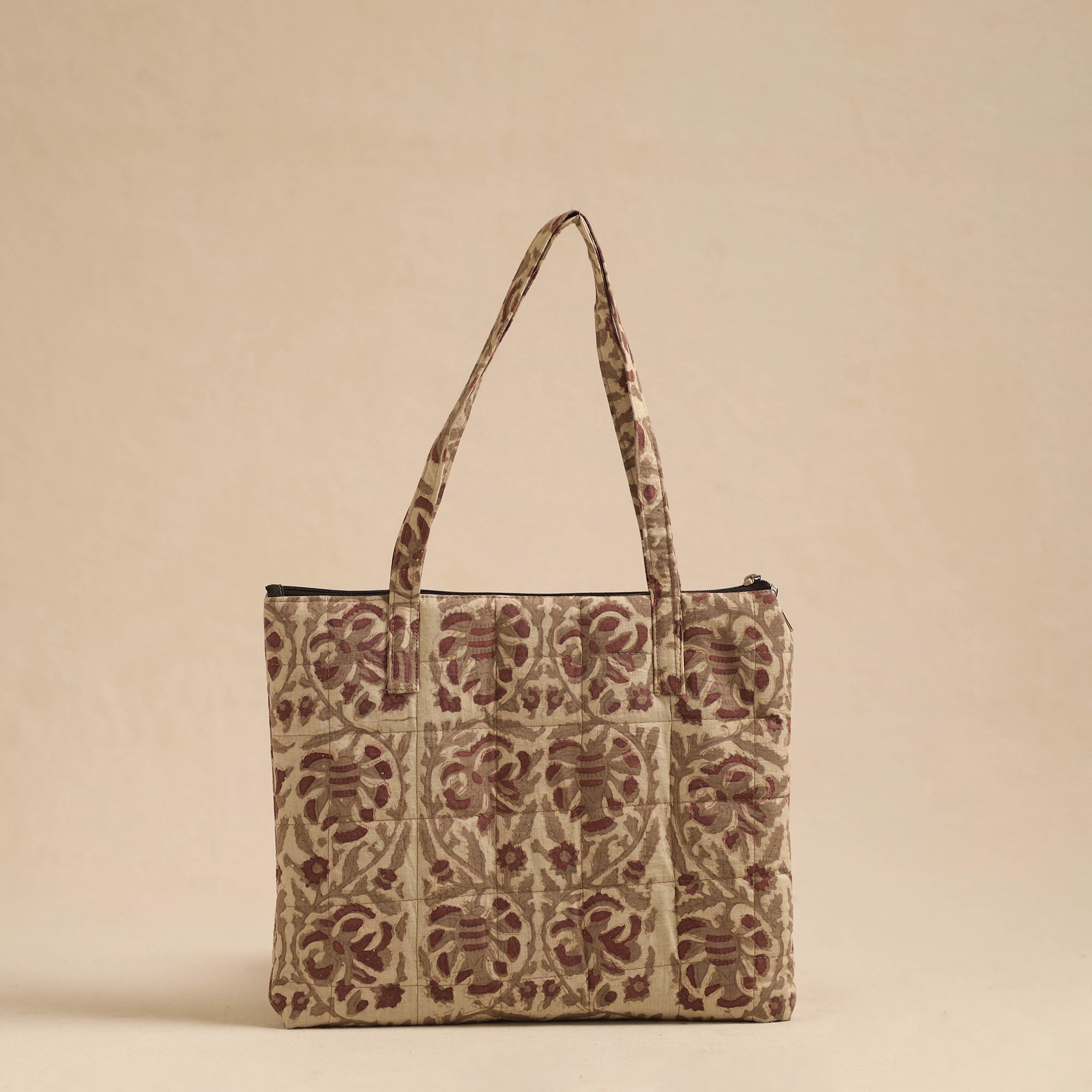 Beige handcrafted quilted cotton hand bag. This hand bag with a zip-lock main closure, providing ample space for your essentials. The foam layer lining ensures durability and protection. Enhance your style with this unique, functional accessory.