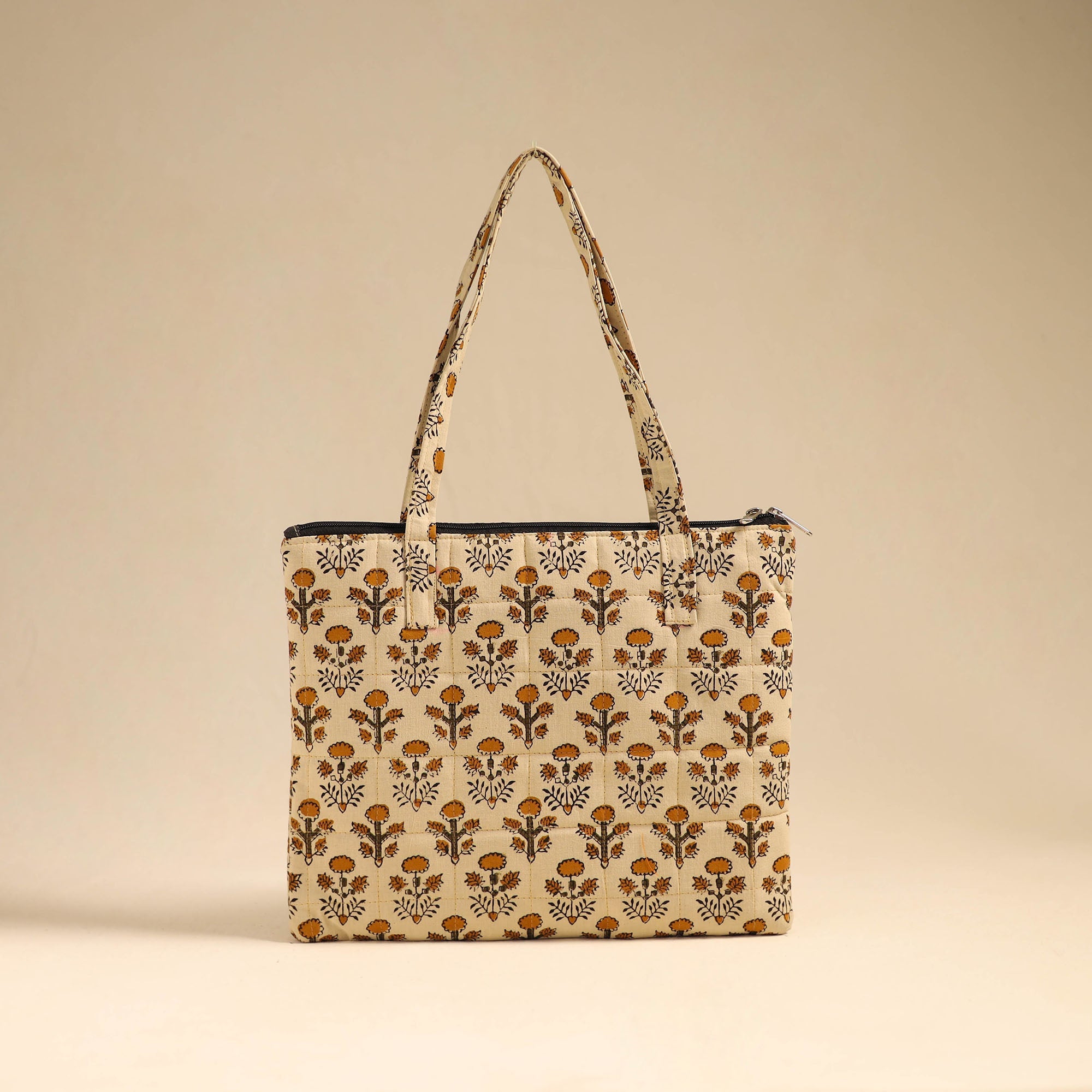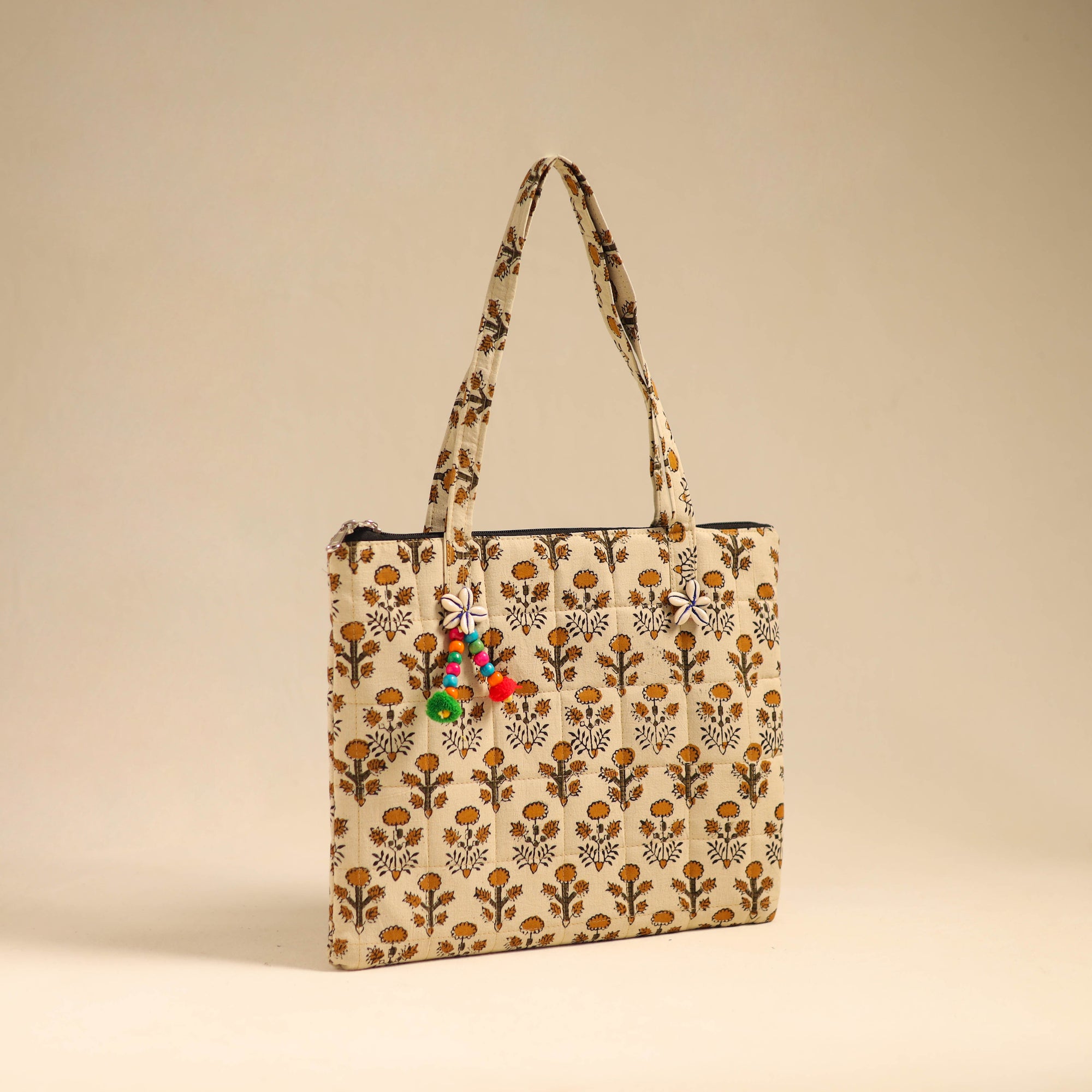 Beige handcrafted quilted cotton handbag. This handbag with a zip-lock main closure, providing ample space for your essentials. The foam layer lining ensures durability and protection. Enhance your style with this unique, functional accessory. Brighten up your day!