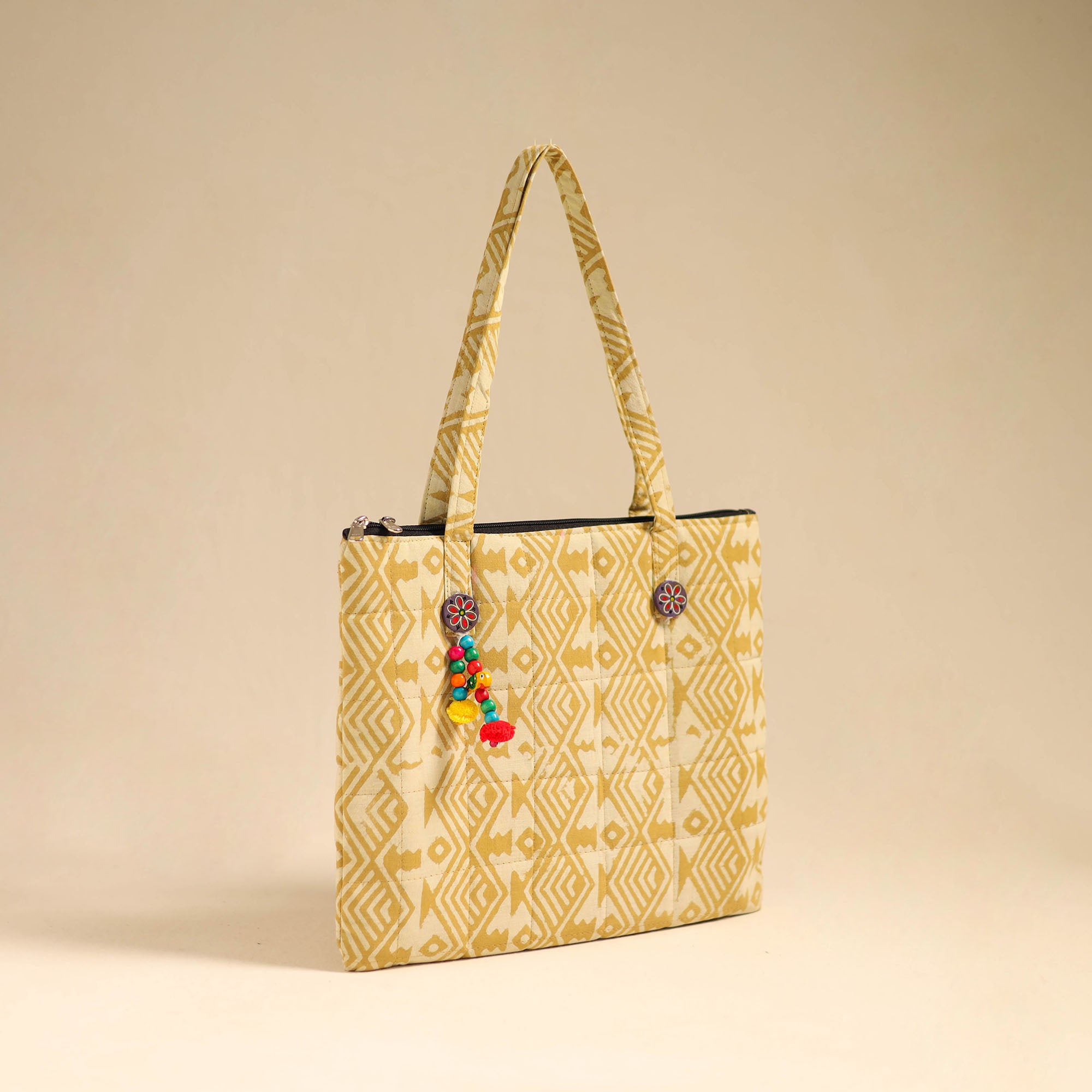 Yellow handcrafted quilted cotton handbag. This handbag with a zip-lock main closure, providing ample space for your essentials. The foam layer lining ensures durability and protection. Enhance your style with this unique, functional accessory. Brighten up your day!