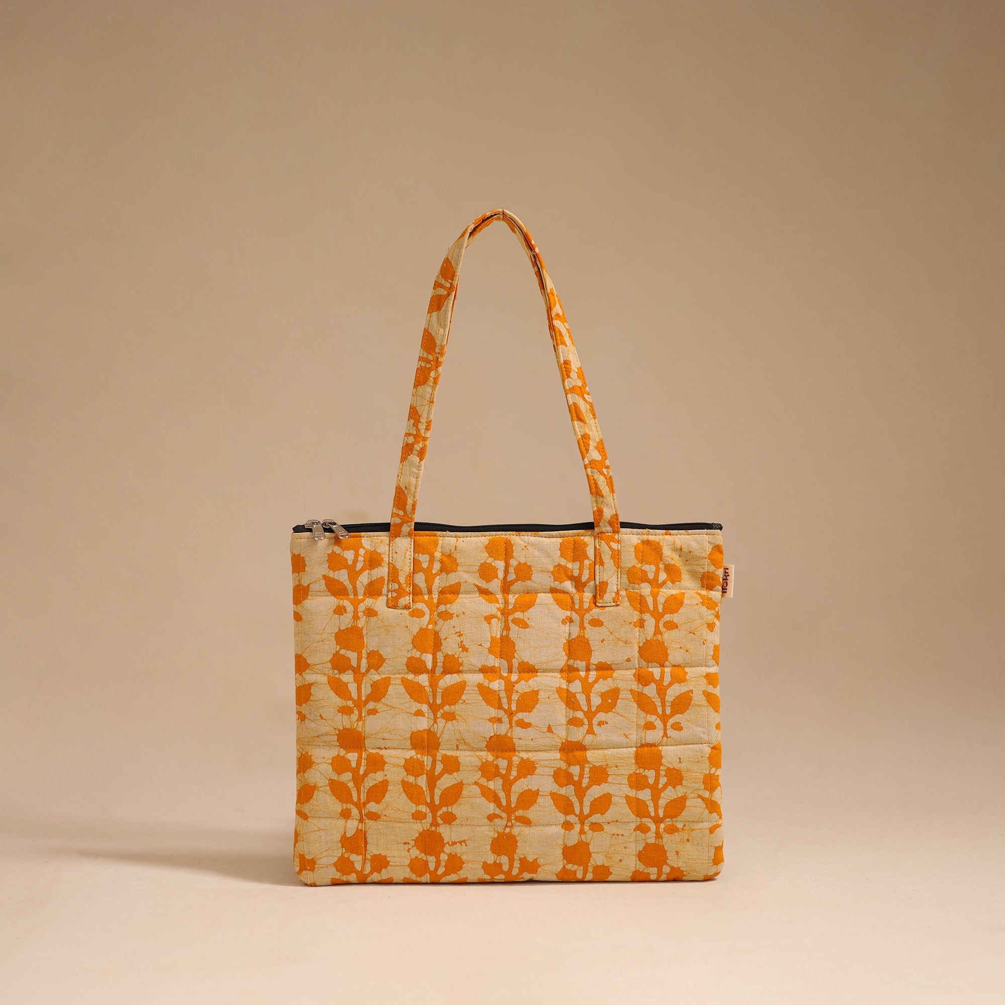 This finely handcrafted orange quilted cotton handbag featuring a secure zippered closure and a spacious interior for your everyday essentials. The soft foam lining enhances durability and protection, making it perfect for daily use or travel. A stylish, functional accessory that effortlessly elevates your look.