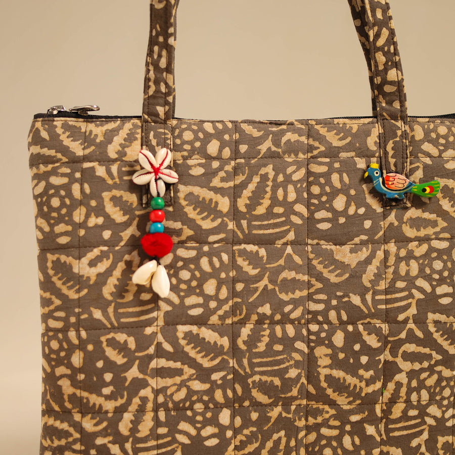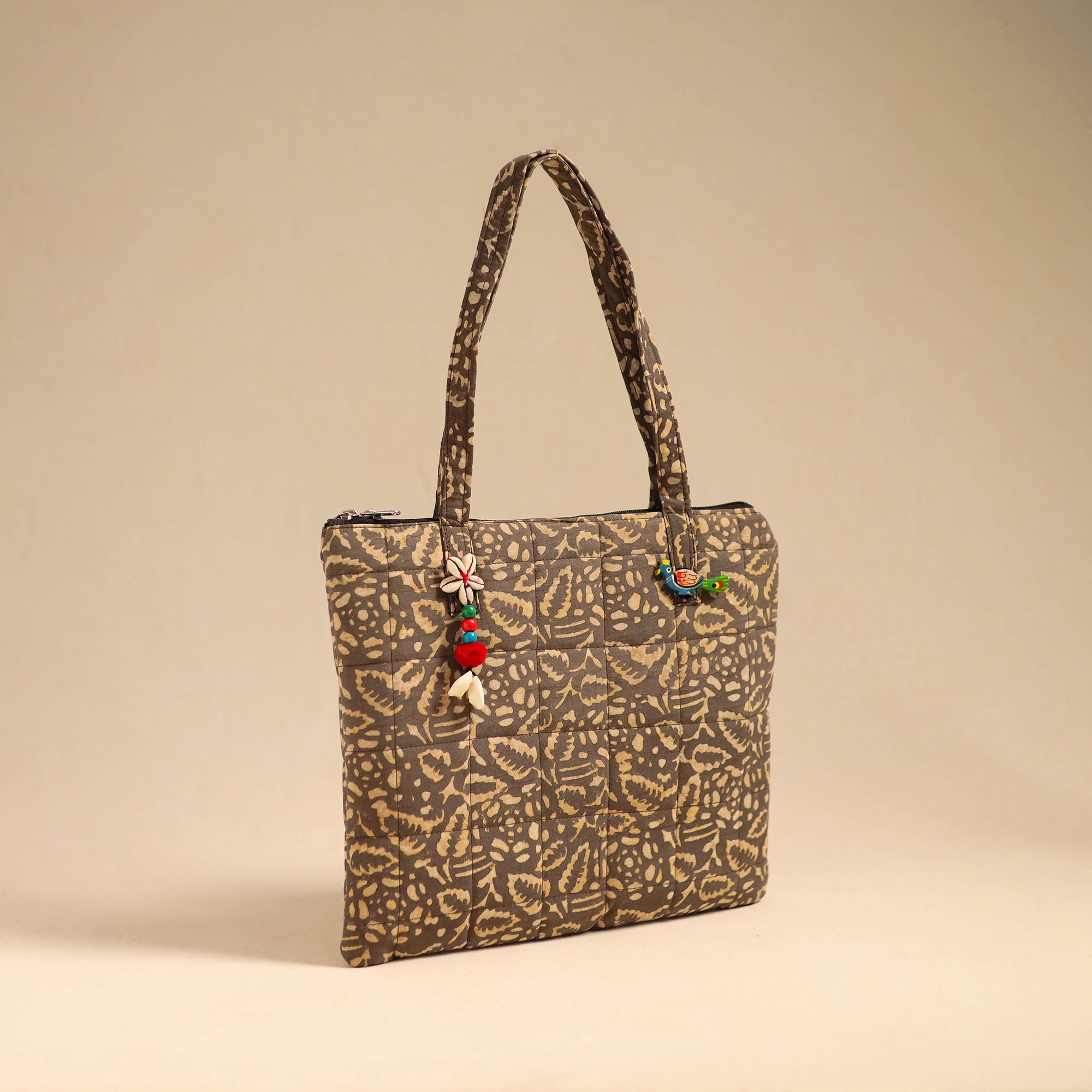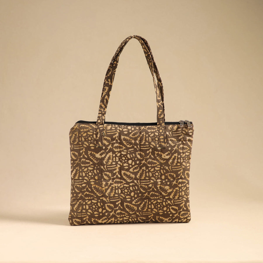 Brown handcrafted quilted cotton handbag. This handbag with a zip-lock main closure, providing ample space for your essentials. The foam layer lining ensures durability and protection. Enhance your style with this unique, functional accessory. Brighten up your day!