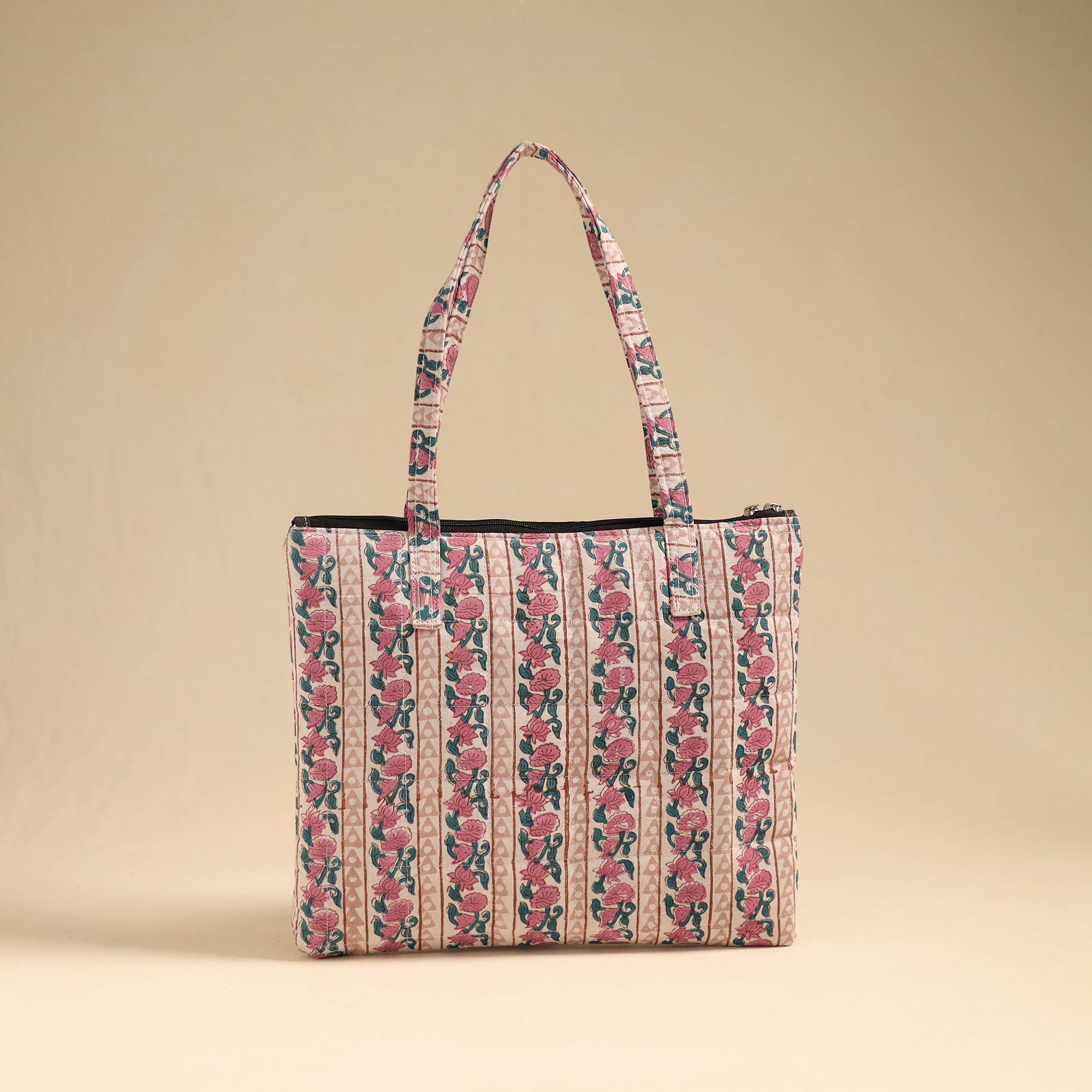 Pink handcrafted quilted cotton handbag. This handbag with a zip-lock main closure, providing ample space for your essentials. The foam layer lining ensures durability and protection. Enhance your style with this unique, functional accessory. Brighten up your day!
