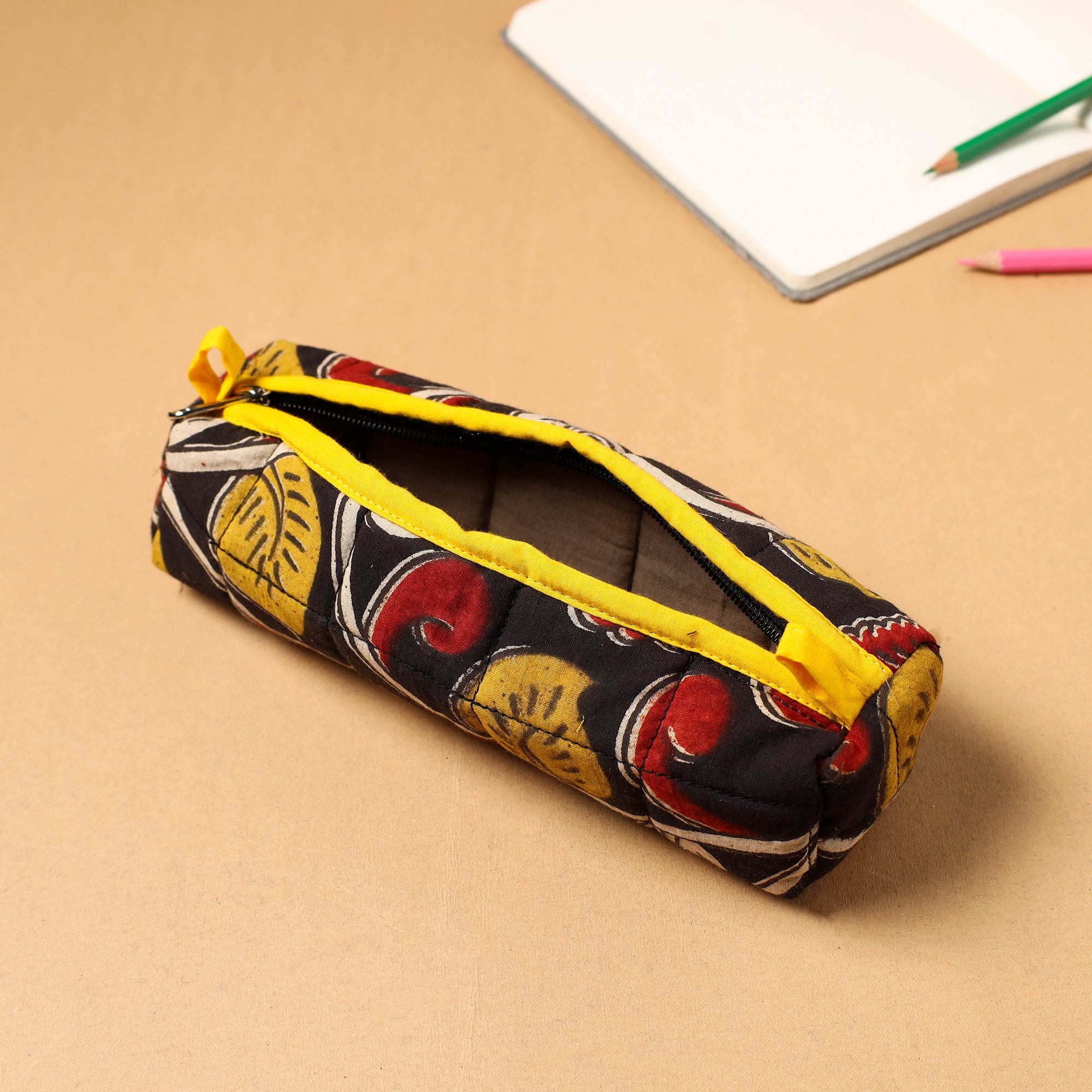 Experience the perfect blend of artistry and utility with our black handcrafted quilted cotton pencil pouch. This pouch is made from cotton fabric with a quilted filling. Safely store your pencils, pens, and other essentials in style.