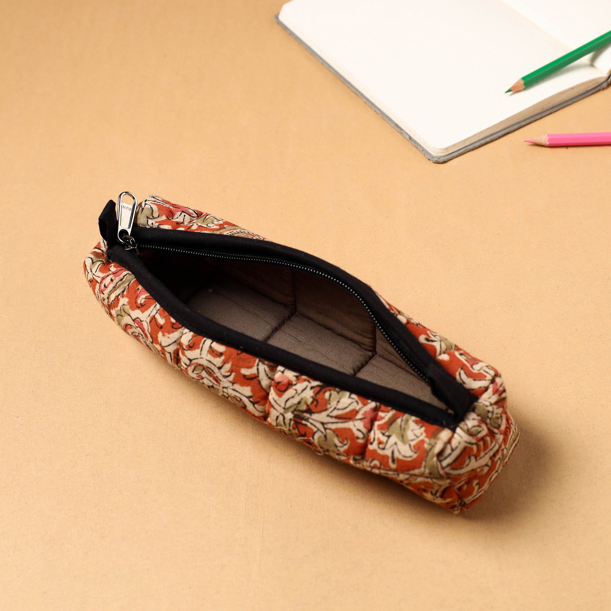 Experience the perfect blend of artistry and utility with our red handcrafted quilted cotton pencil pouch. This pouch is made from cotton fabric with a quilted filling. Safely store your pencils, pens, and other essentials in style.