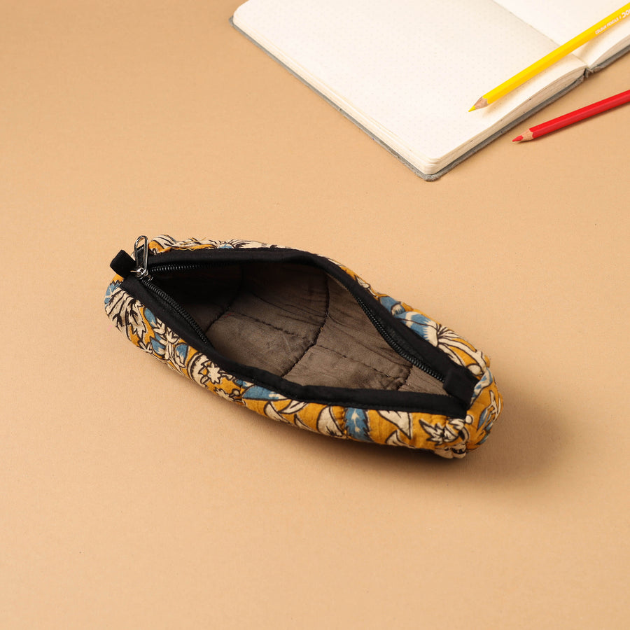 Experience the perfect blend of artistry and utility with our yellow handcrafted quilted cotton pencil pouch. This pouch is made from cotton fabric with a quilted filling. Safely store your pencils, pens, and other essentials in style.