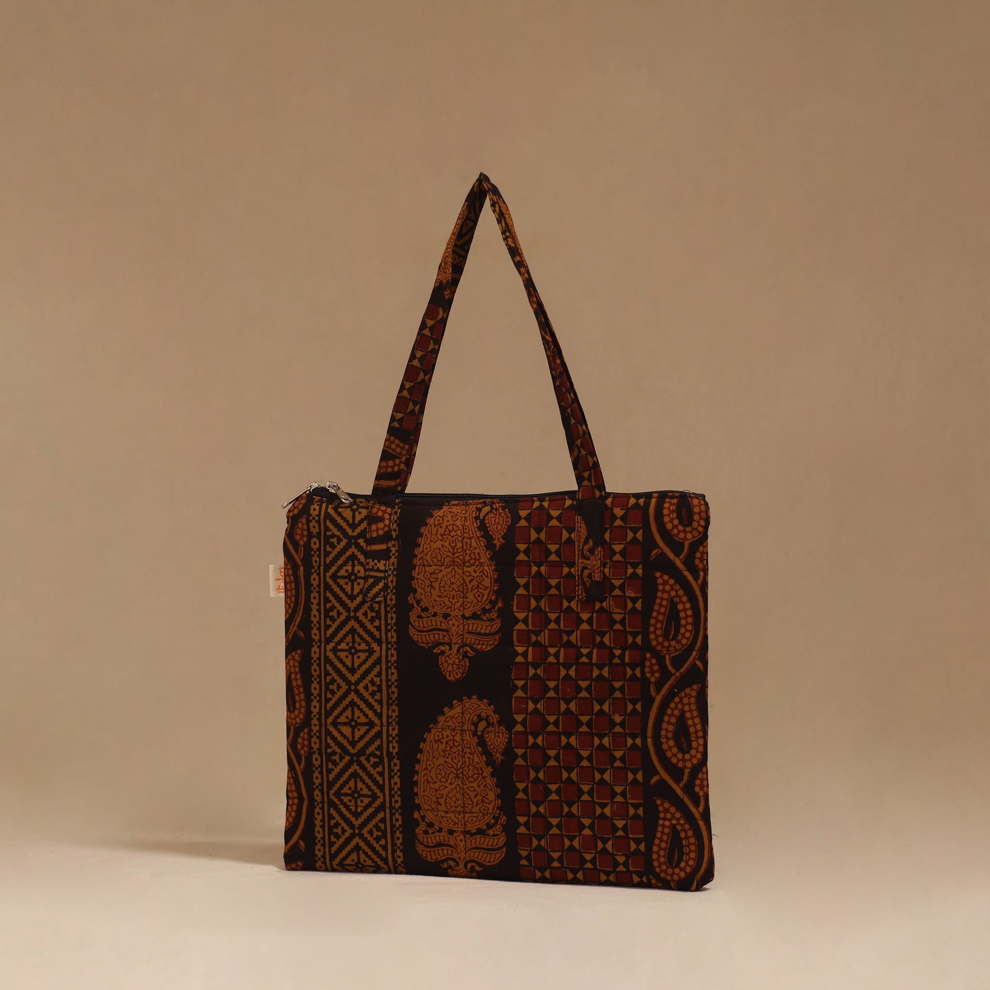 Handcrafted quilted handbag featuring bagh hand block print, designed with a secure zippered closure and a spacious interior for everyday essentials. Made from cotton fabric, with soft foam lining that adds durability and protection, making it suitable for daily use or travel.