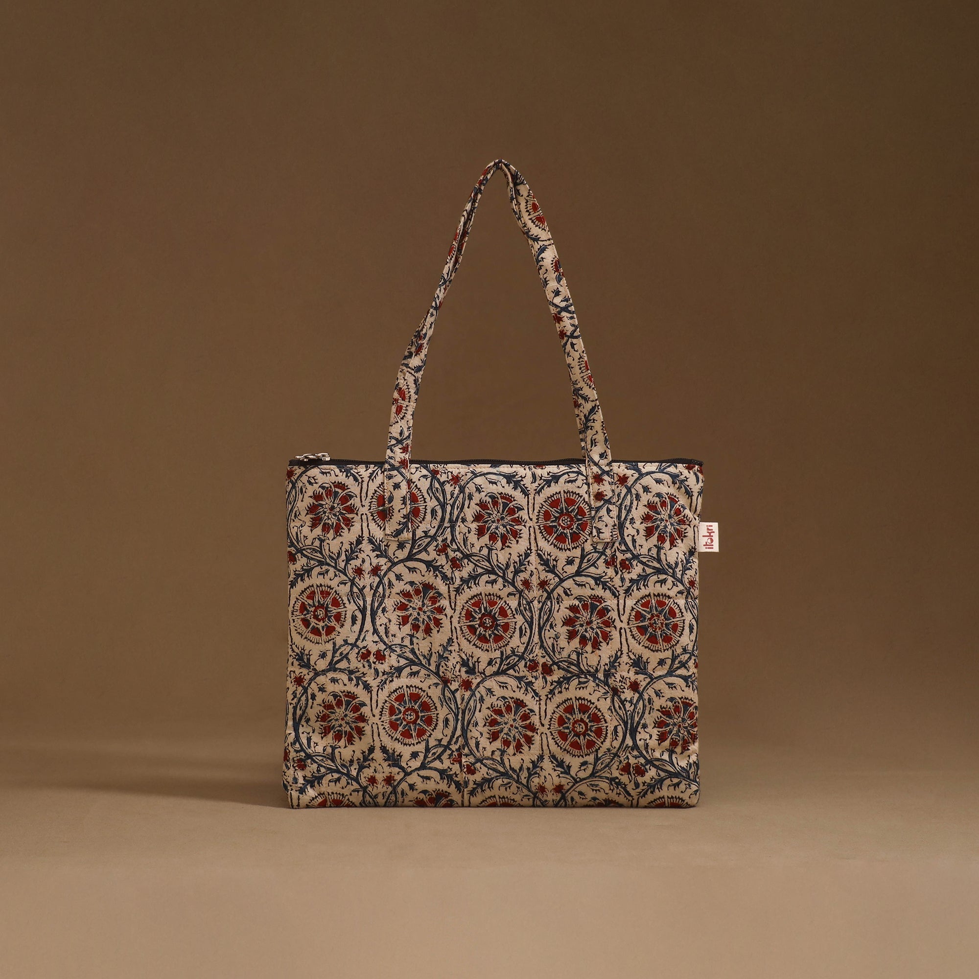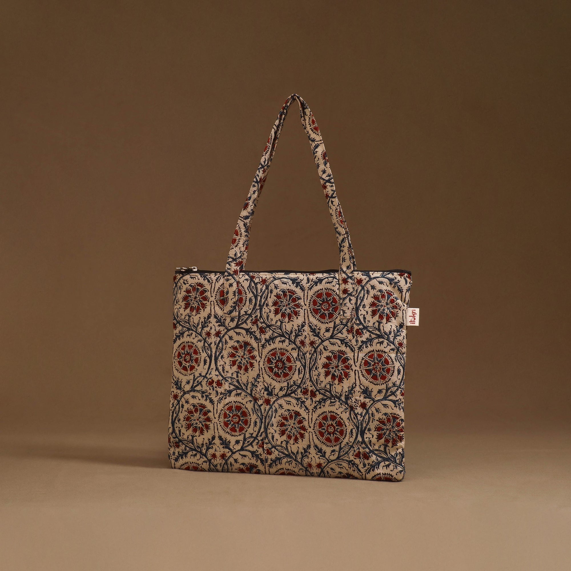 Handcrafted quilted handbag in cotton featuring a secure zippered closure and a spacious interior for your everyday essentials. The soft foam lining enhances durability and protection, making it perfect for daily use or travel.