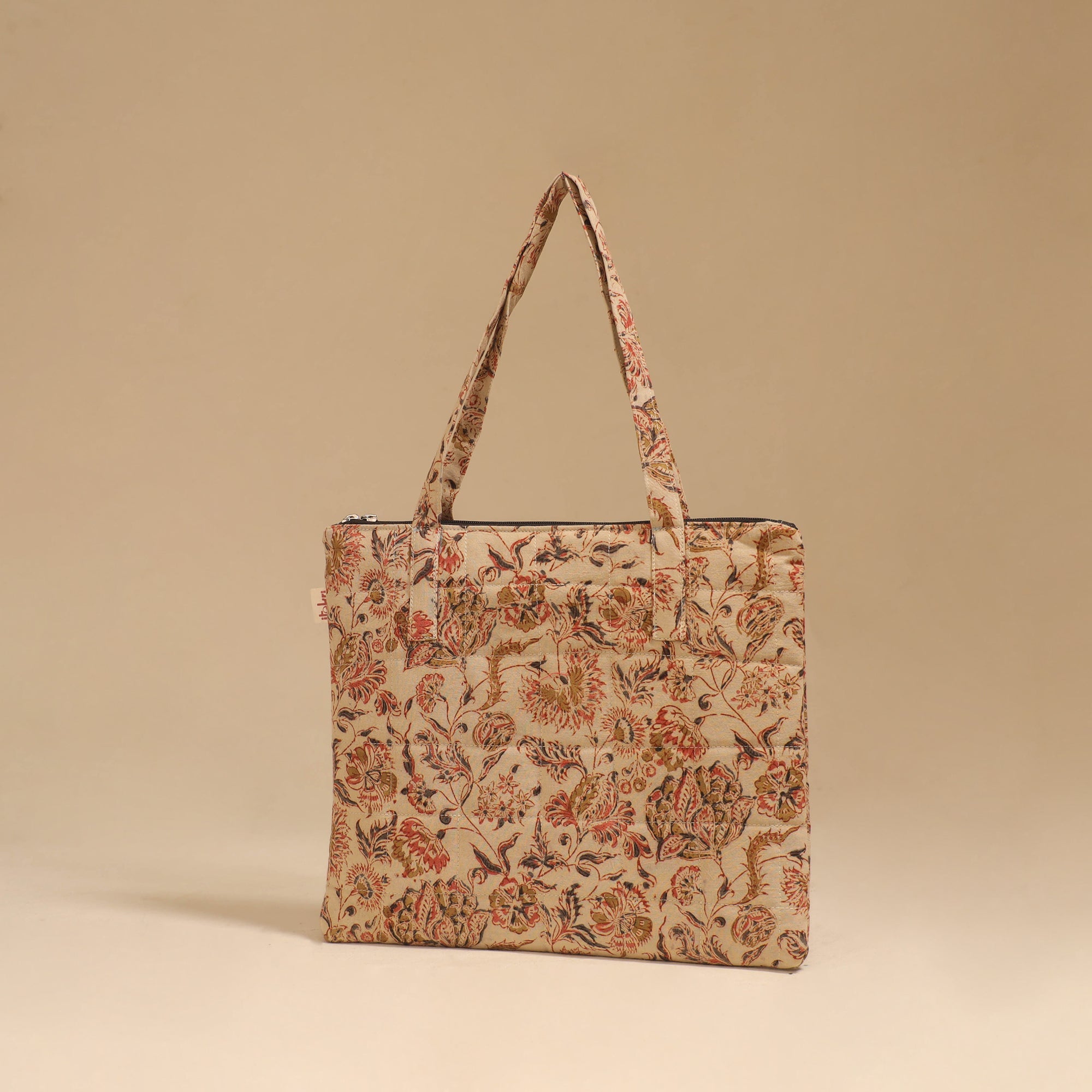 Handcrafted quilted handbag made from cotton fabric with soft foam lining for added durability and protection. It features a secure zippered closure and is spacious enough to carry your daily essentials like a wallet, diary, water bottle or small purchases. Ideal for work day, trips or weekend errands.