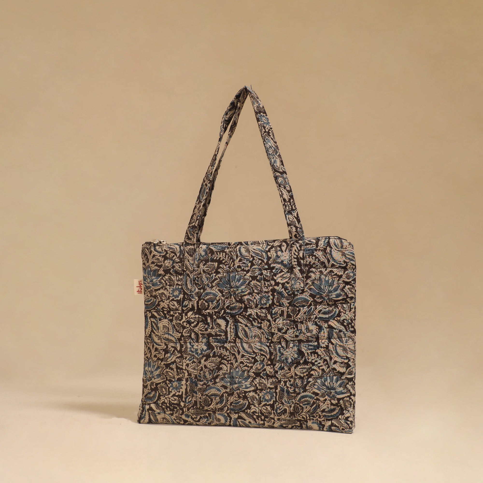 Handcrafted quilted handbag made from cotton fabric with soft foam lining for added durability and protection. It features a secure zippered closure and is spacious enough to carry your daily essentials like a wallet, diary, water bottle or small purchases. Ideal for work day, trips or weekend errands.