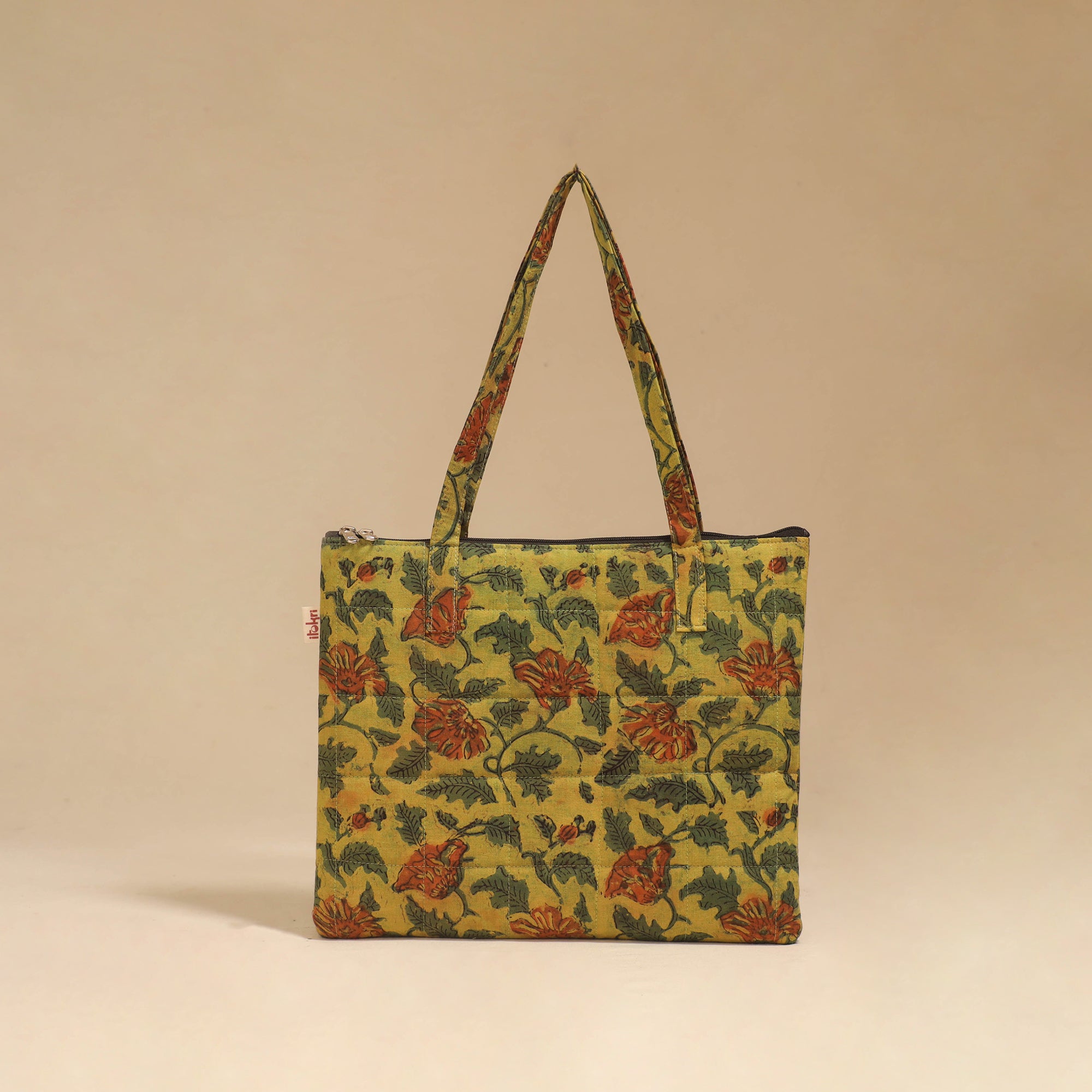 Handcrafted quilted handbag made from cotton fabric with soft foam lining for added durability and protection. It features a secure zippered closure and is spacious enough to carry your daily essentials like a wallet, diary, water bottle or small purchases. Ideal for work day, trips or weekend errands.