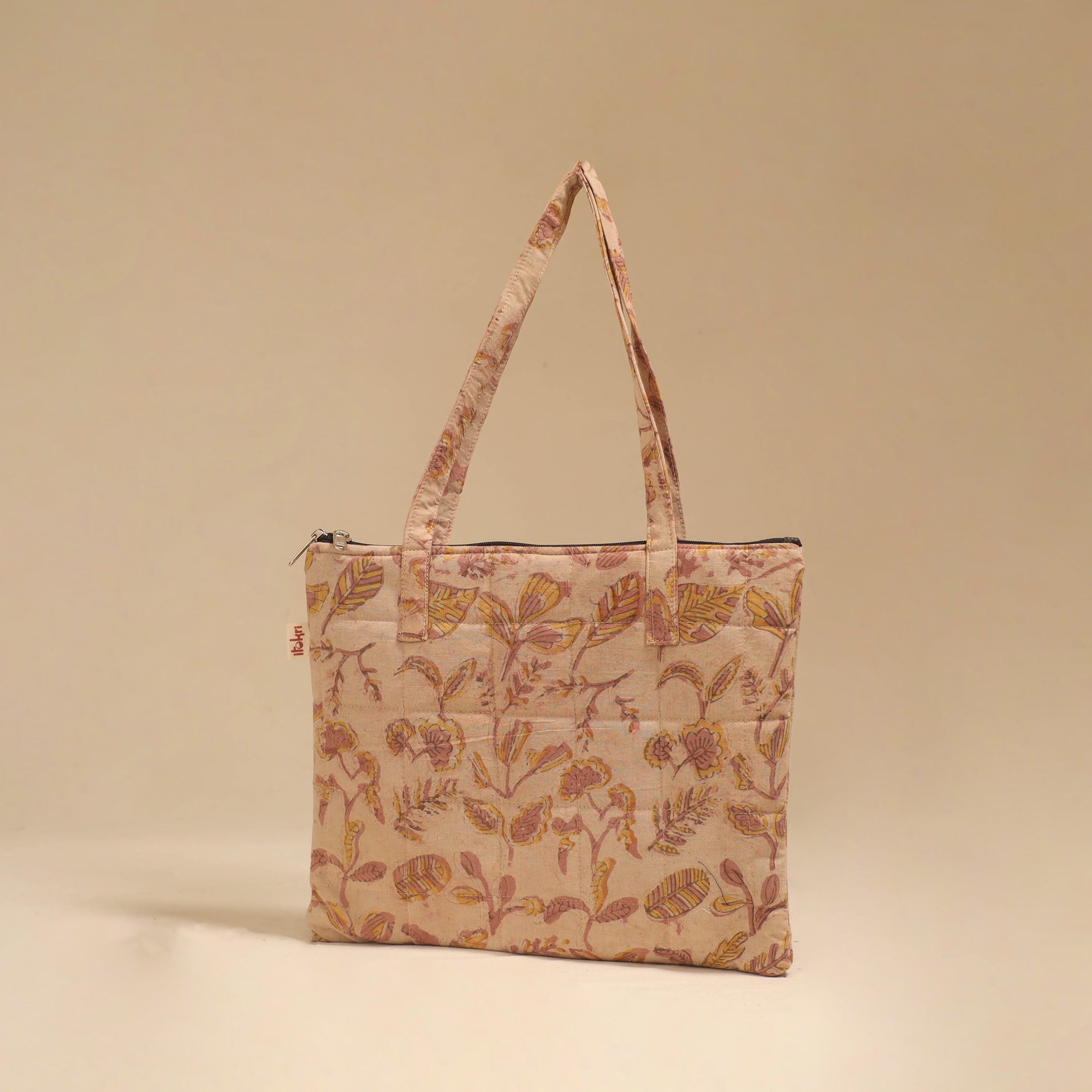 Handcrafted quilted handbag made from cotton fabric with soft foam lining for added durability and protection. It features a secure zippered closure and is spacious enough to carry your daily essentials like a wallet, diary, water bottle or small purchases. Ideal for work day, trips or weekend errands.