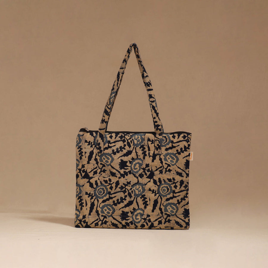 Brown handcrafted quilted handbag featuring batik block print, designed with a secure zippered closure and a spacious interior for everyday essentials. Made from cotton fabric, with soft foam lining that adds durability and protection, making it suitable for daily use or travel.