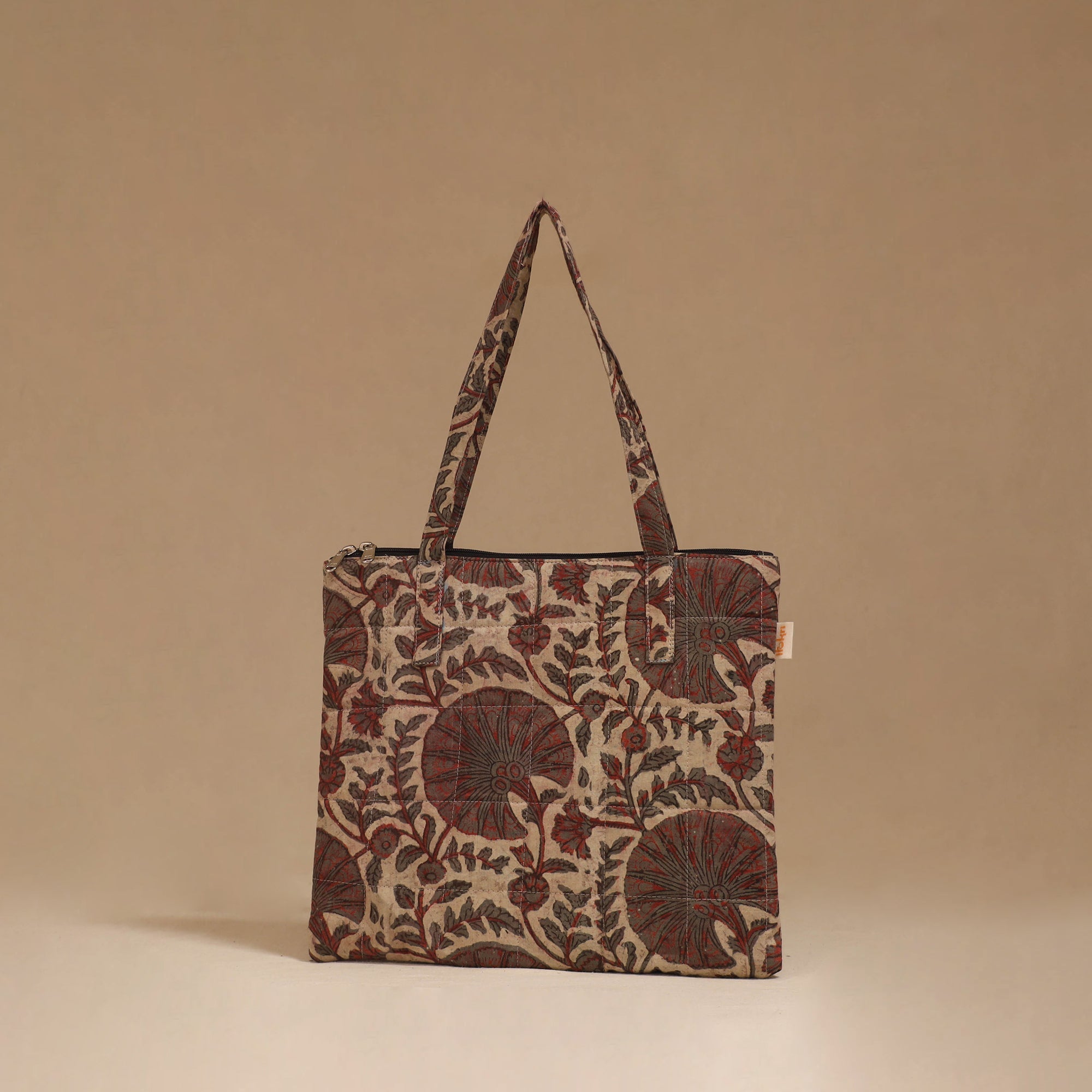 Brown handcrafted quilted handbag featuring bagru block print, designed with a secure zippered closure and a spacious interior for everyday essentials. Made from cotton fabric with soft foam lining that adds durability and protection, making it suitable for daily use or travel.