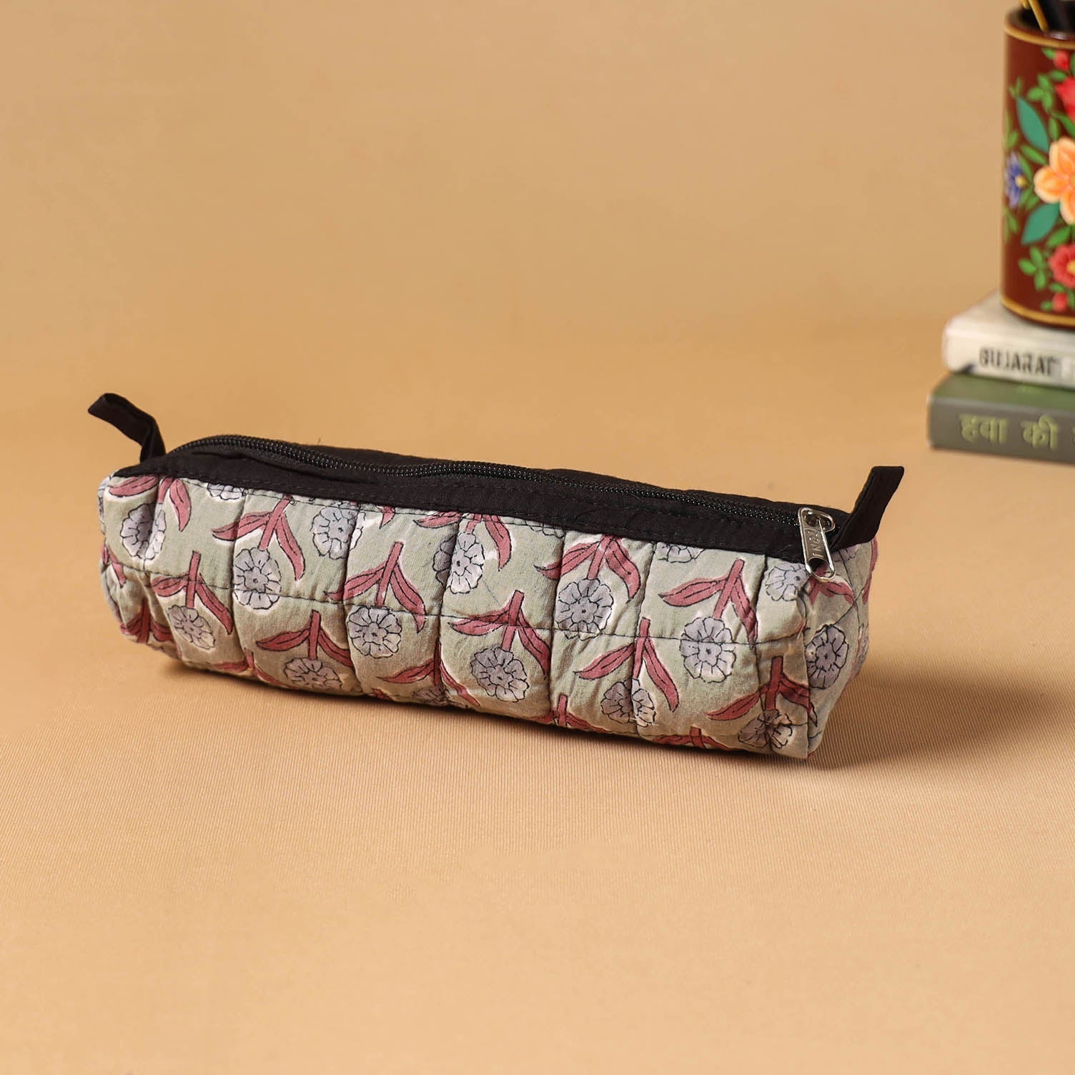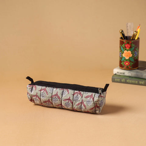 Green quilted pencil pouch is crafted from cotton fabric using the traditional sanganeri printing technique, with intricate hand block patterns. It provides gentle protection and ample space, making it easy to organize your pens, pencils and small accessories for everyday use.