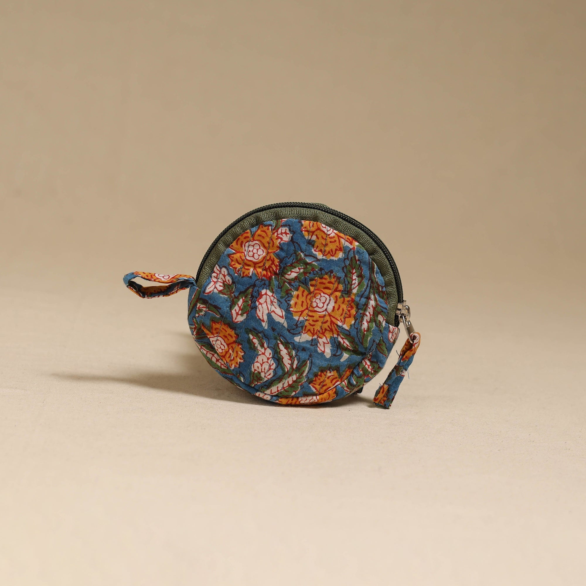 | Material | Handcrafted quilted blue sanganeri block printed fabric suneeta coin pouch is developed by iTokri in collaboration with Chhoti Si Asha. Compact and round in shape, it is designed to store coins, earbuds, folded notes, and small jewellery. The quilted structure helps maintain shape while protecting contents. It features a smooth zip closure for secure storage. Soft and easy to carry, it fits neatly into bags or pockets, while the side loop allows quick handling or easy attachment. |