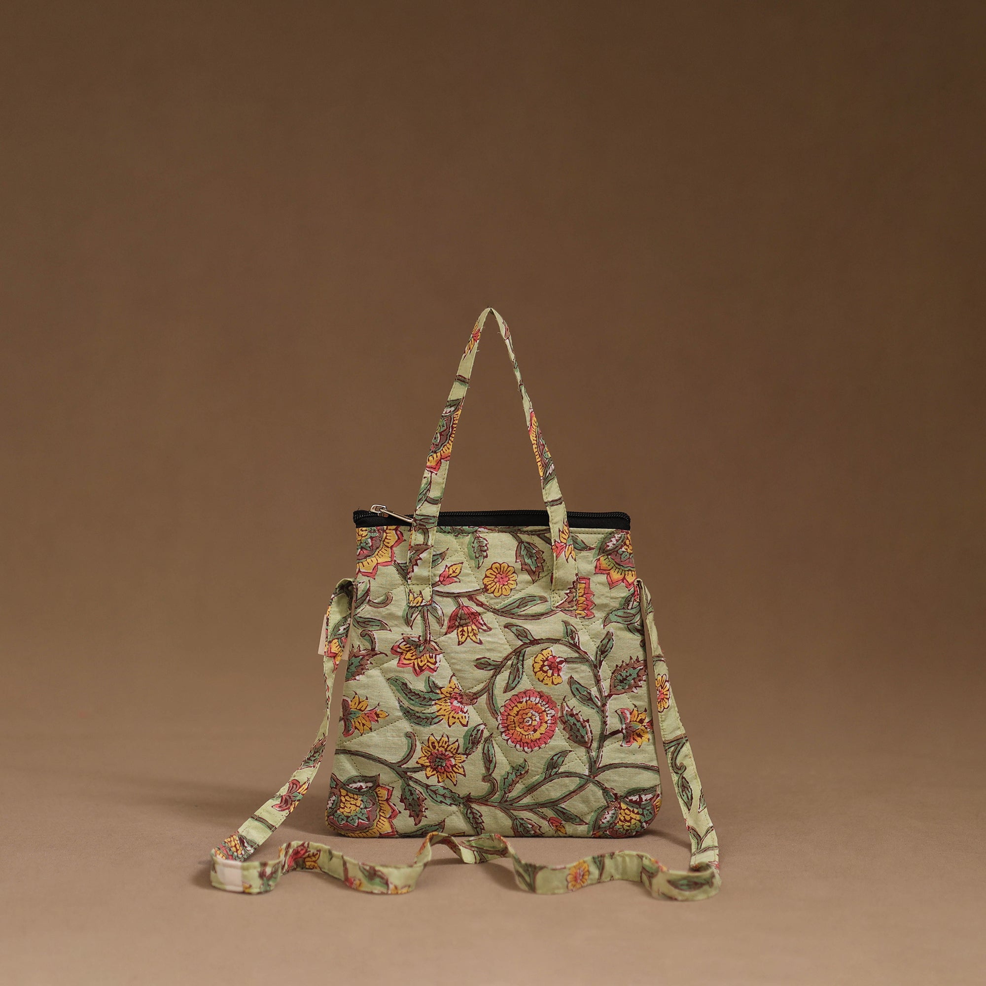 Make every outing stylish with this handmade sling bag in cotton. Designed with quilted layers for added safety, it features four pockets to carry your everyday essentials. Comfortable to use for daily activities, trips or casual outings.