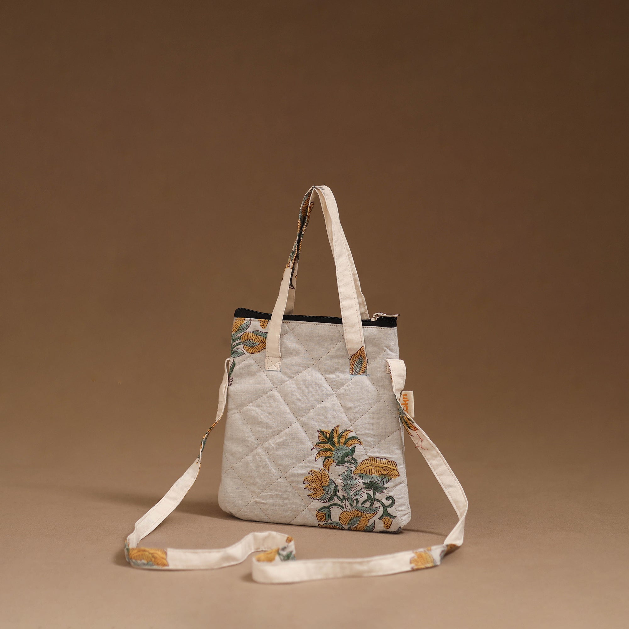 Make every outing stylish with this handmade sling bag in cotton. Designed with quilted layers for added safety, it features four pockets to carry your everyday essentials. Comfortable to use for daily activities, trips or casual outings.