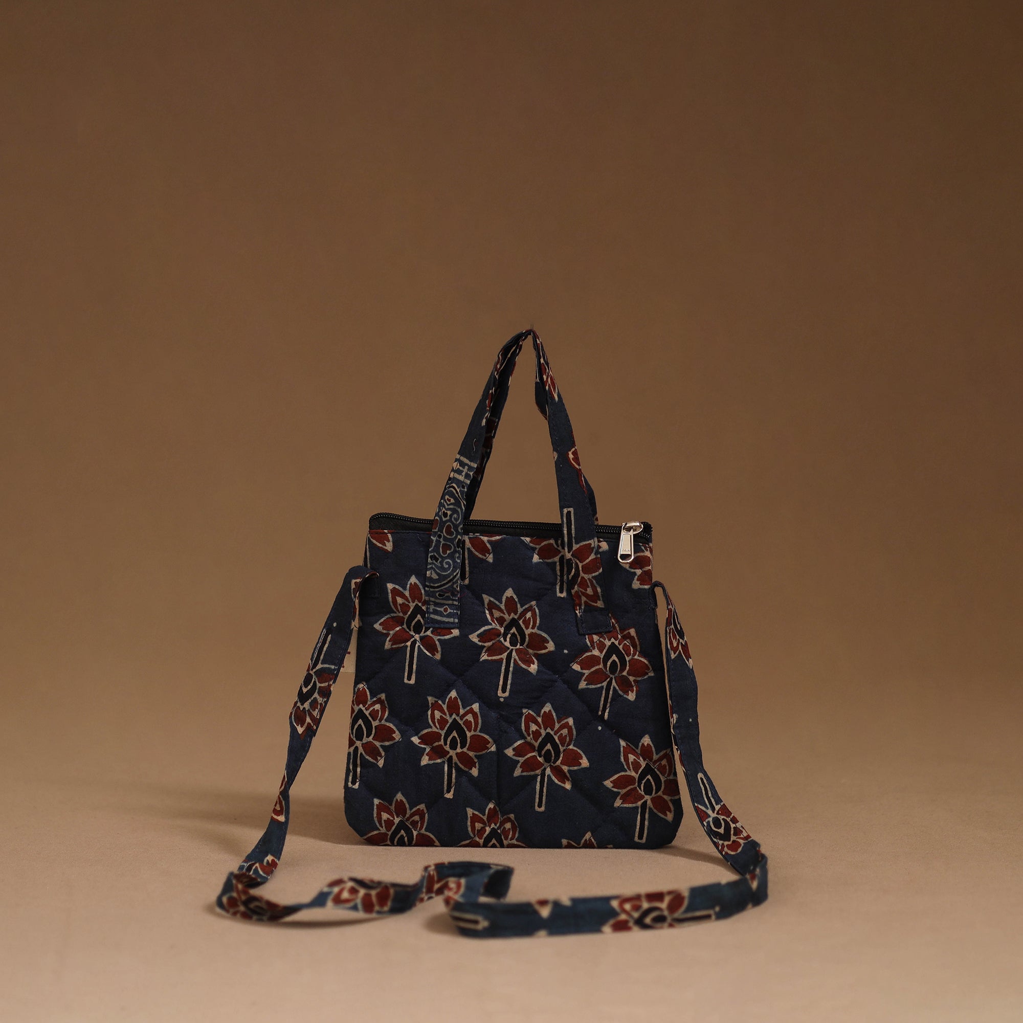 Make every outing stylish with this handmade sling bag in cotton. Designed with quilted layers for added safety, it features four pockets to carry your everyday essentials. Comfortable to use for daily activities, trips or casual outings.
