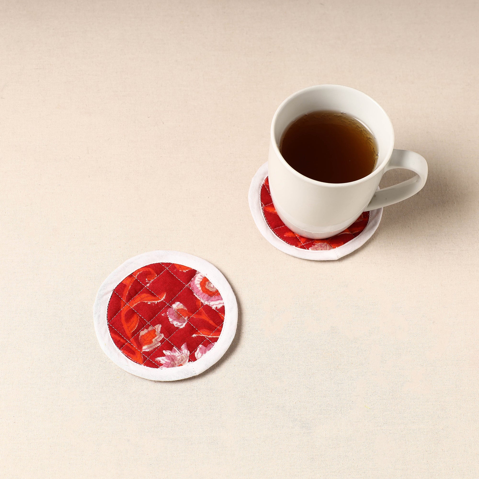 Elevate your table decor with our red handcrafted sanganeri print coaster set, made using traditional block printing techniques. These eco-friendly coasters feature vibrant are crafted from soft quilted cotton to protect surfaces while adding to your dining or coffee table. Reflecting the rich cultural heritage of Sanganer, Rajasthan, these coasters blend artistry with utility.