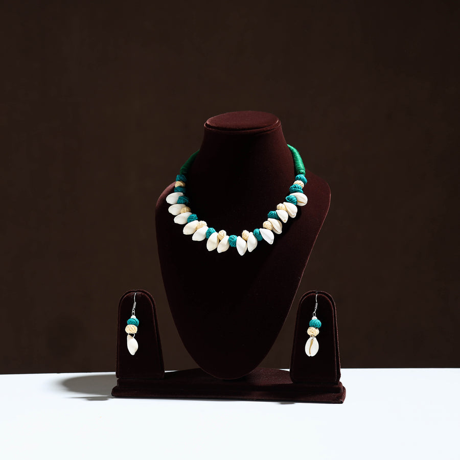 Add a touch of tradition to your wardrobe with this white handcrafted shell & thread work necklace set. Featuring intricate thread work & shells, this set includes a matching pair of earrings, making it ideal for both casual outings and festive occasions.