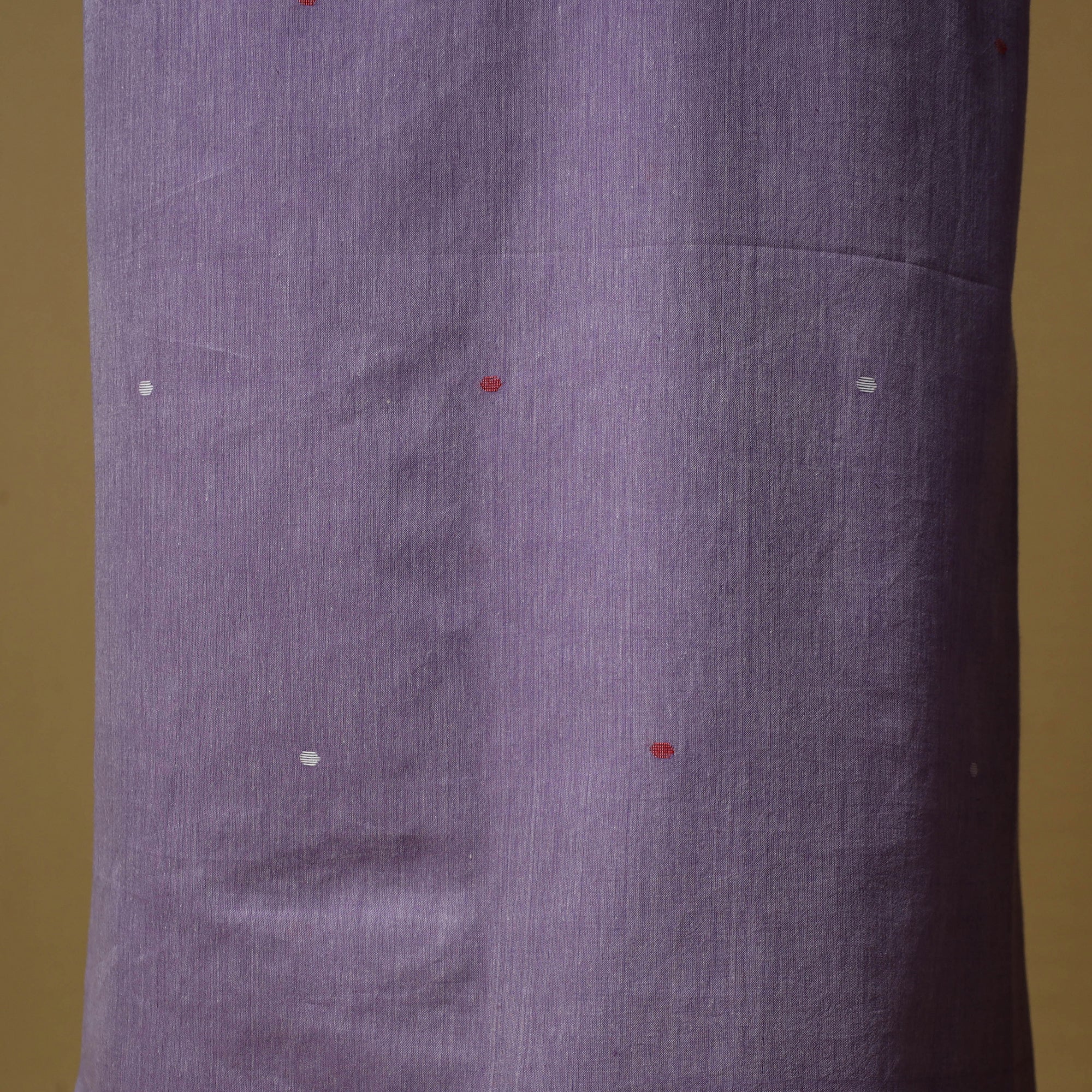 Purple bengal jamdani cotton dress material is thoughtfully crafted by skilled artisans using the traditional extra-weft weaving technique. Each motif is woven directly on the loom, creating an embroidery-like effect without any surface embellishment. Jamdani is one of the most time-intensive and treasured weaving traditions of India. The 2pc set includes kurta fabric with a matching dupatta, making it suitable for festive gatherings, cultural events, office wear or elegant daytime outings where comfort and grace come together.