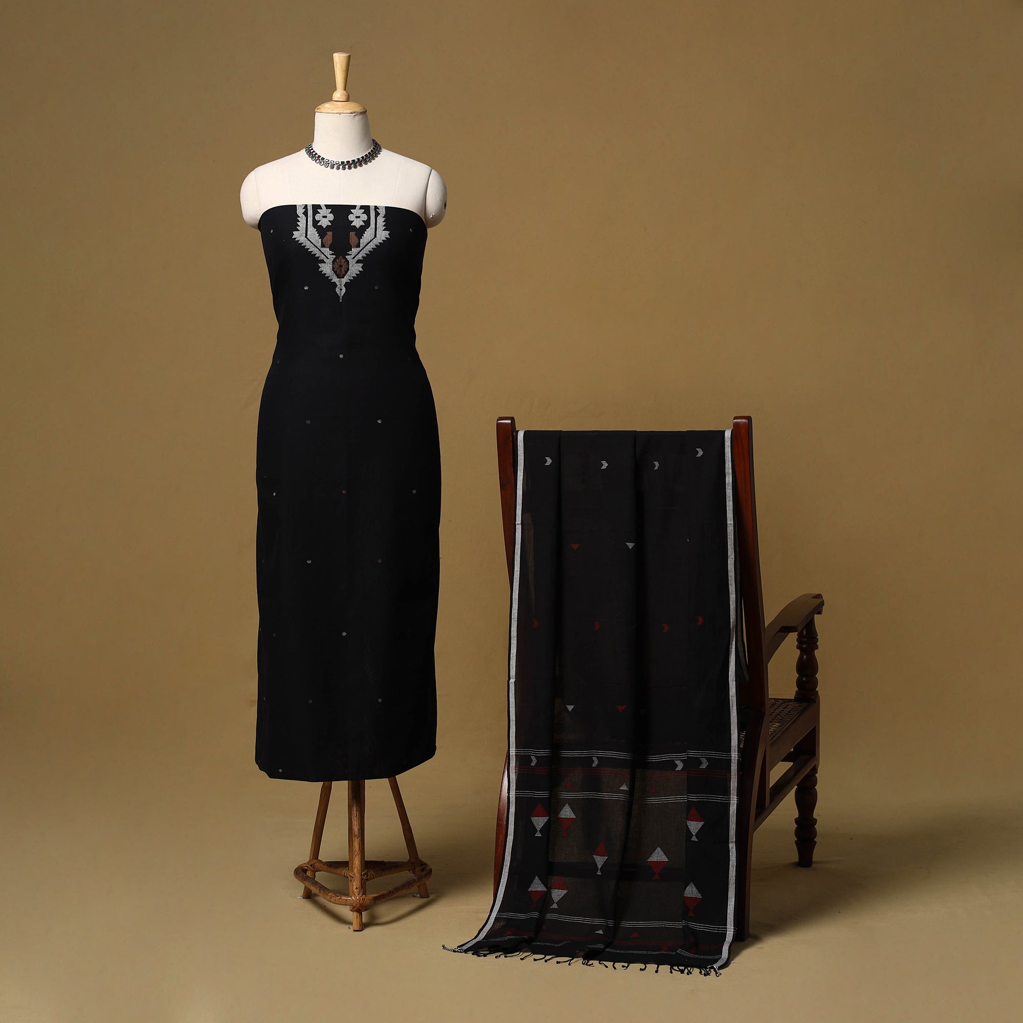 Bengal jamdani cotton 2pc unstitched dress material is thoughtfully woven by skilled artisans from Bengal using the traditional extra-weft technique. Each motif is created directly on the loom, resulting in an embroidery-like appearance without any surface embellishment. Jamdani is among the most time-intensive and treasured weaving traditions of India. The 2pc set includes kurta fabric with a coordinated dupatta, making it ideal for festive gatherings, cultural events, office wear or elegant daytime outings where comfort meets understated grace.