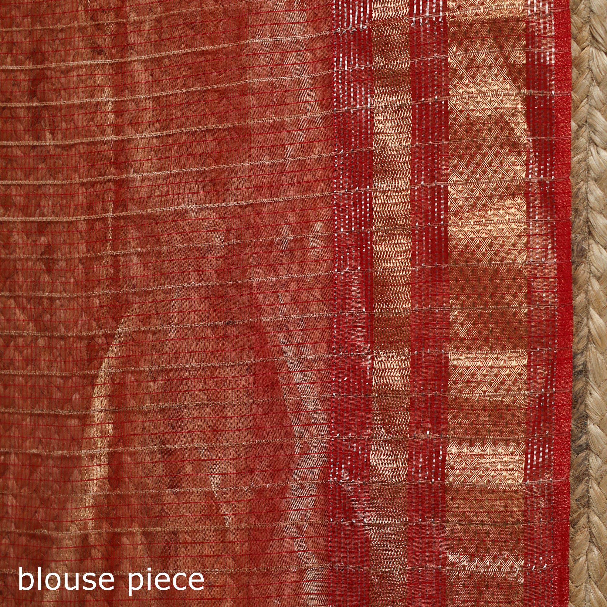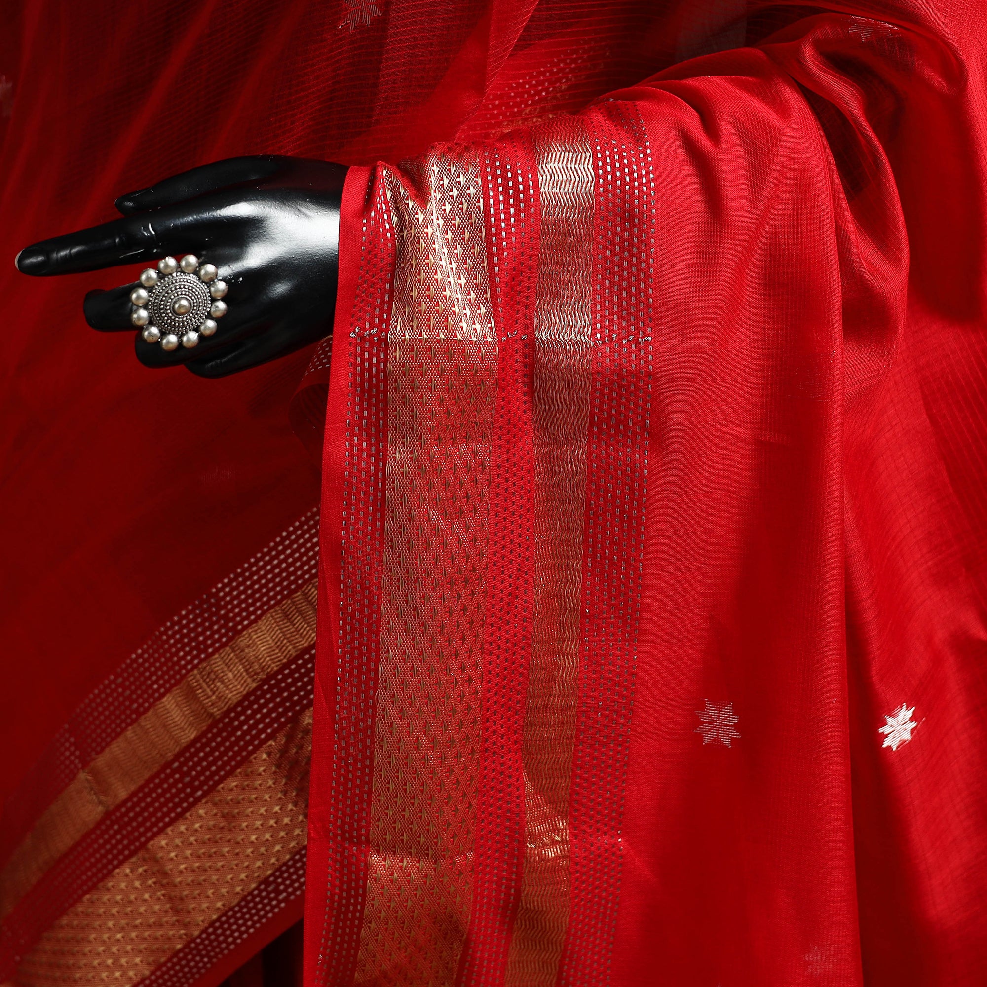 Maheshwari handloom buti saree with zari border is woven by artisans in Maheshwar, Madhya Pradesh, using traditional weaving techniques. It uses organza silk 2/130 denial in the warp and mercerised cotton 2/120 in the weft, which gives the saree a comfortable feel and a light sheen. Suitable for both everyday wear and celebrations.