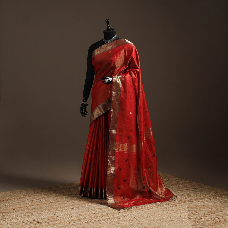 Tissue zari weave maheshwari handloom buti saree with zari border is woven by artisans in Maheshwar, Madhya Pradesh, using traditional weaving techniques. It uses organza silk 2/130 denial in the warp and mercerised cotton 2/120 in the weft, which gives the saree a comfortable feel and a light sheen. Suitable for both everyday wear and celebrations.
