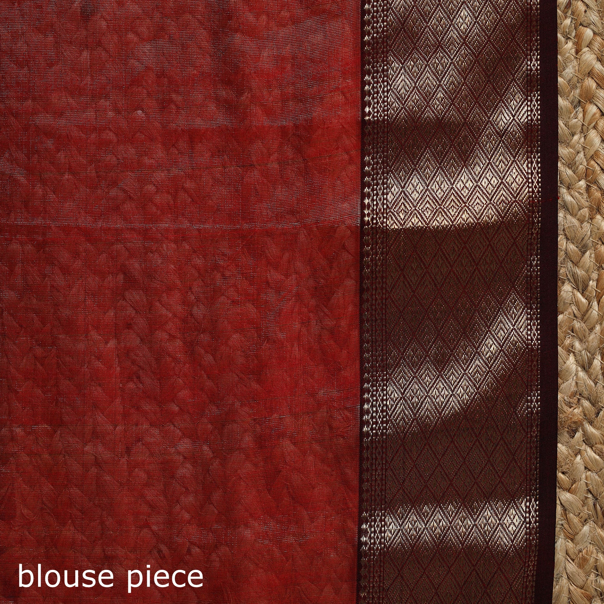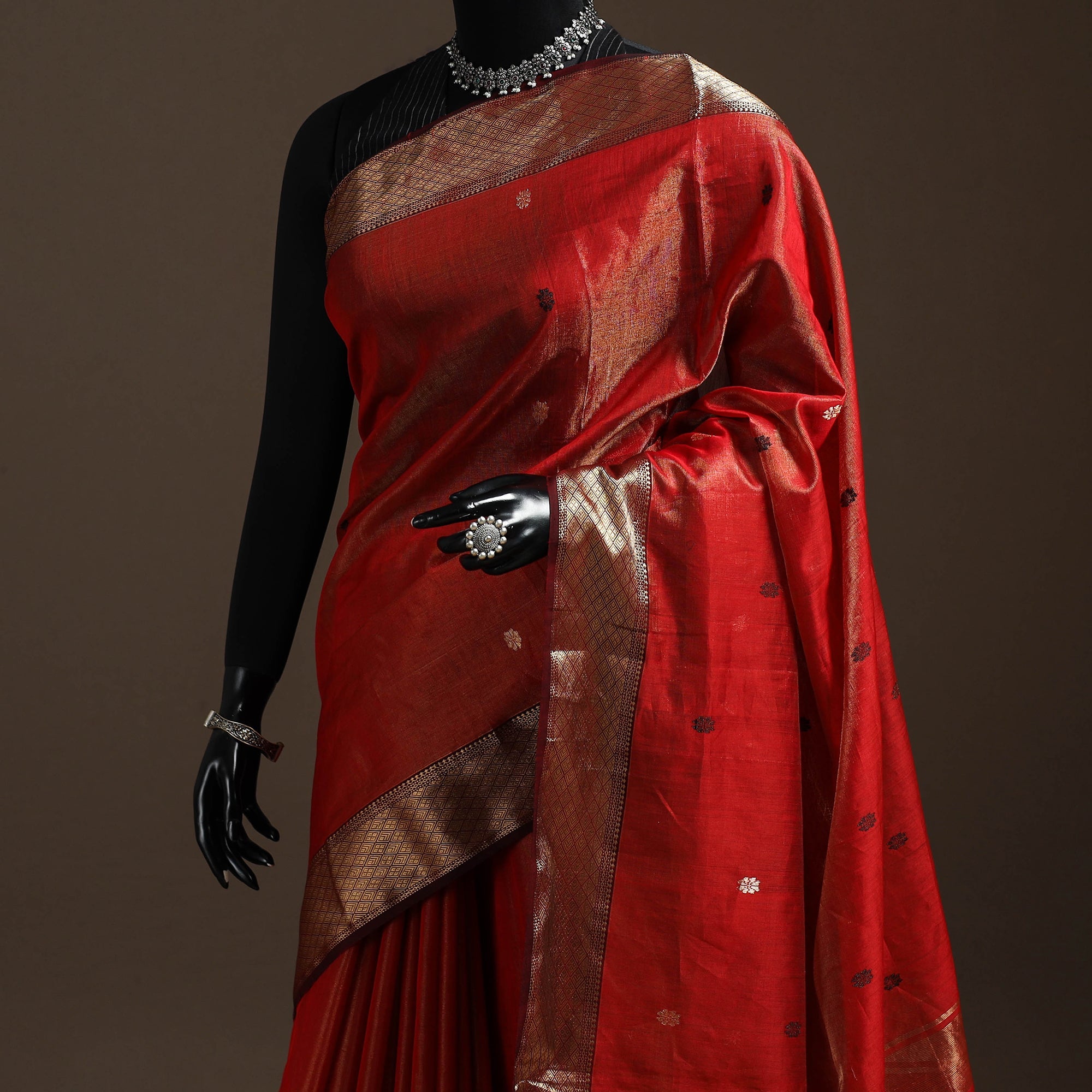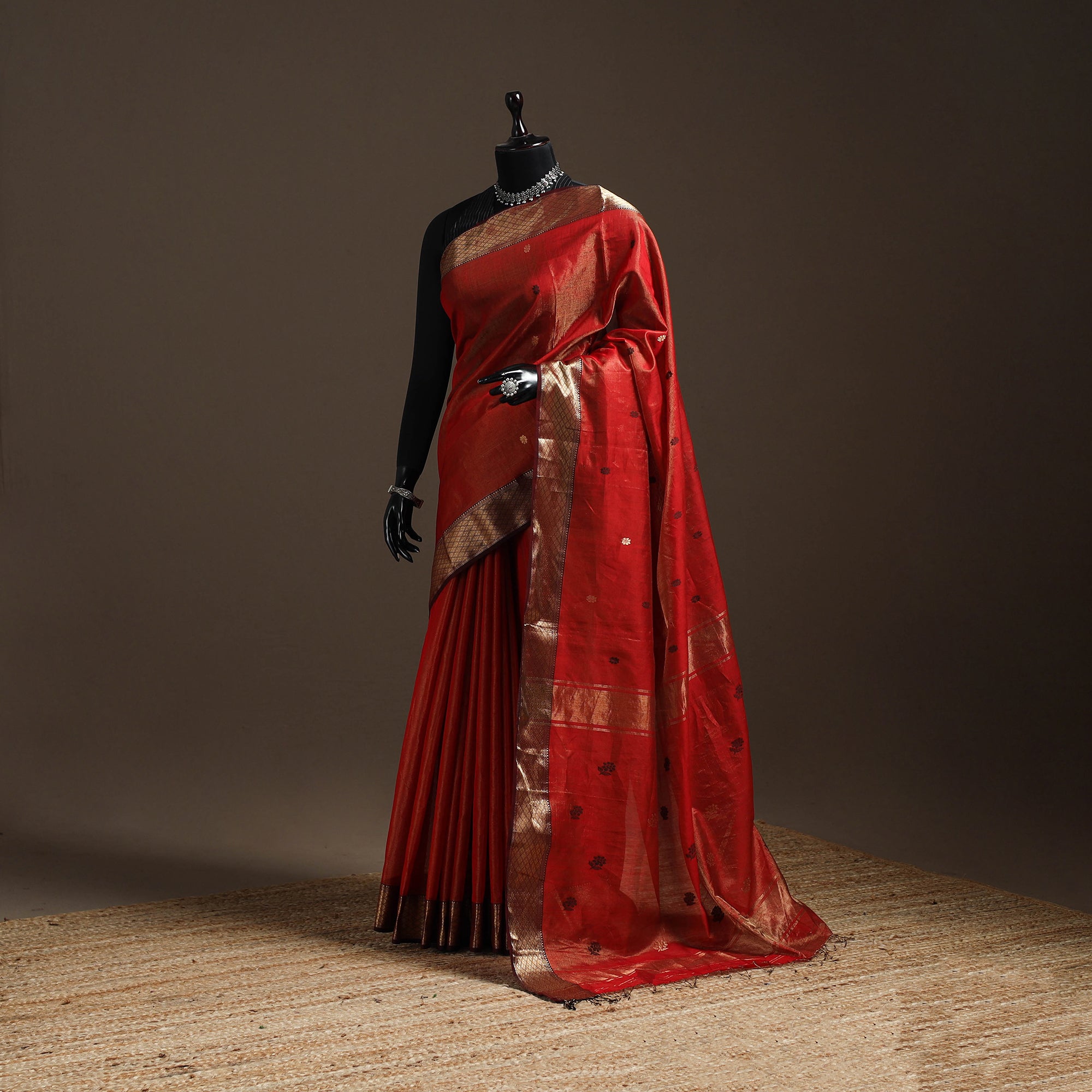 Red tissue zari weave maheshwari handloom buti saree with zari border is woven by artisans in Maheshwar, Madhya Pradesh, using traditional weaving techniques. It uses organza silk 2/130 denial in the warp and mercerised cotton 2/120 in the weft, which gives the saree a comfortable feel and a light sheen. Suitable for both everyday wear and celebrations.