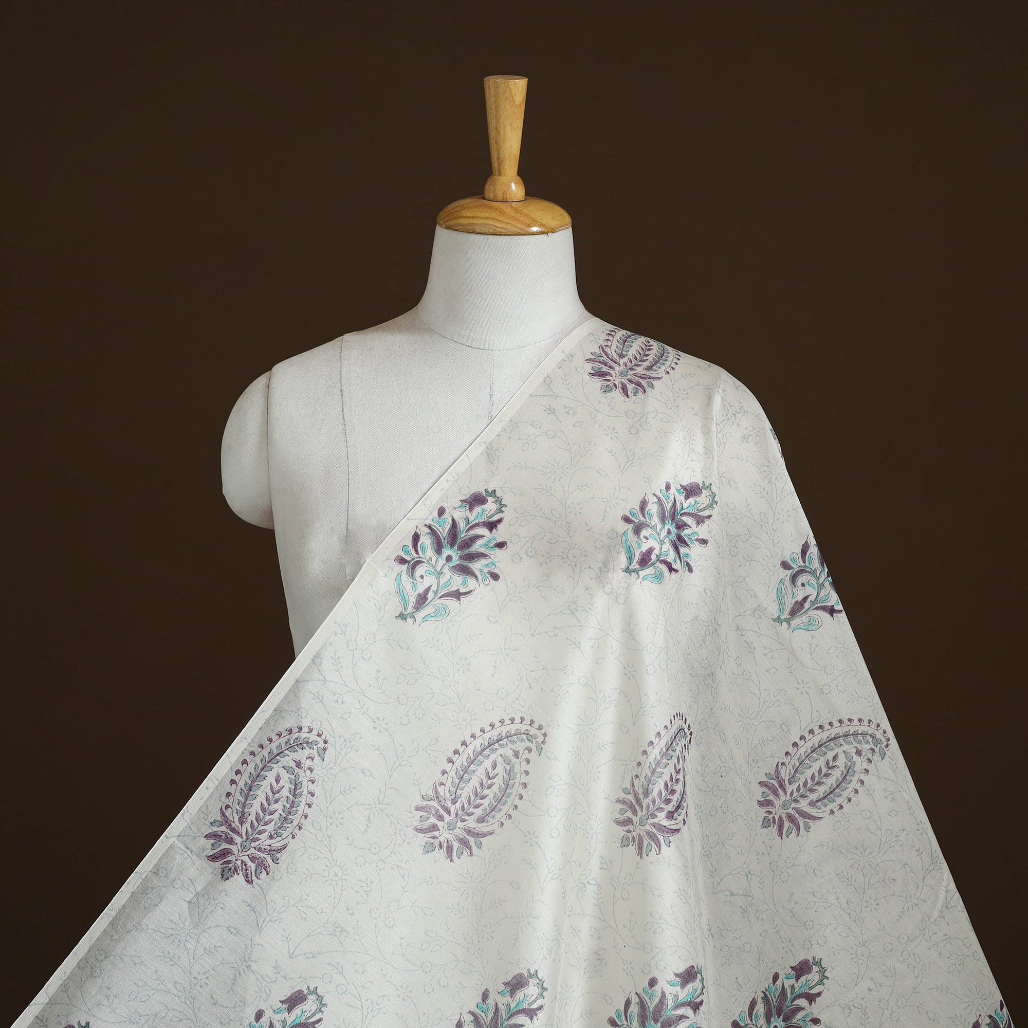 This white block-printed handloom chanderi silk cotton fabric from Rajasthan showcases delicate sanganeri motifs and is dyed using bleed-free VAT colours. Lightweight, elegant, and artisan-crafted, it’s perfect for creating thoughtful apparel or home décor. An easy way to infuse cultural charm into your everyday designs.