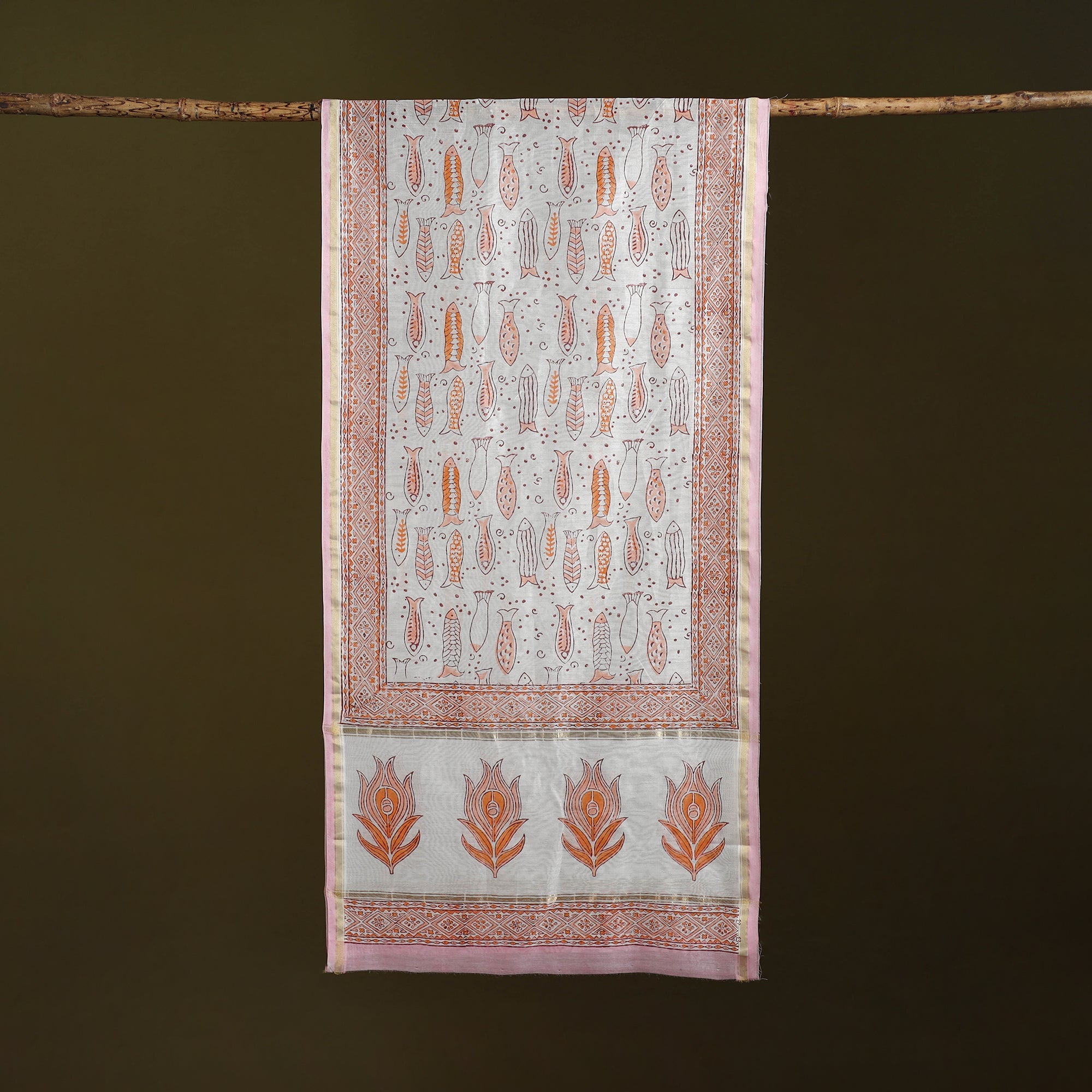 | Material | Pink sanganeri stole with a zari border from Rajasthan features intricate floral motifs created using traditional hand block printing techniques. Crafted with VAT dyes for vibrant, long-lasting colours. Made from chanderi silk cotton, known for its fine weave and light airy texture. Note : This piece carries tiny knots, thread pulls or uneven lines not flaws but fingerprints. Every irregularity is a whisper from the hands that made it. It’s what happens when tradition weaves through time not machines. If you’re looking for perfection, this isn’t it. But if you’re looking for soul you’ve found it. |