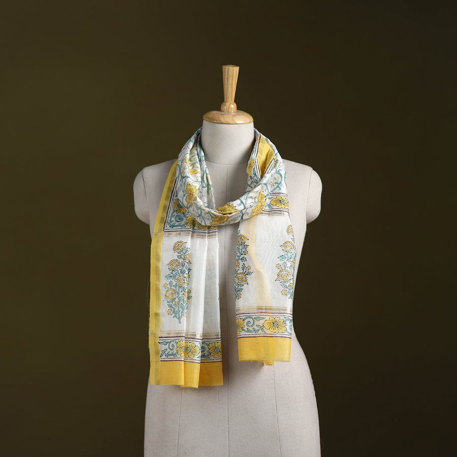 | Material | Yellow sanganeri stole with a zari border from Rajasthan features intricate floral motifs created using traditional hand block printing techniques. Crafted with VAT dyes for vibrant, long-lasting colours. Made from chanderi silk cotton, known for its fine weave and light airy texture. Note : This piece carries tiny knots, thread pulls or uneven lines not flaws but fingerprints. Every irregularity is a whisper from the hands that made it. It’s what happens when tradition weaves through time not machines. If you’re looking for perfection, this isn’t it. But if you’re looking for soul you’ve found it. |