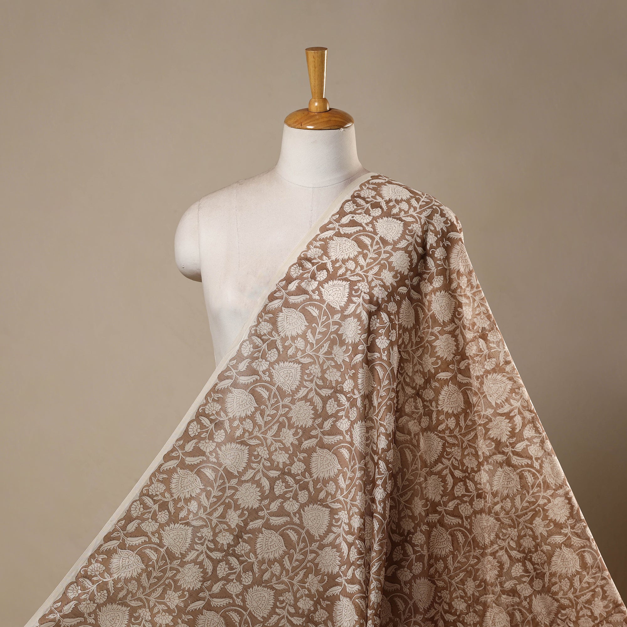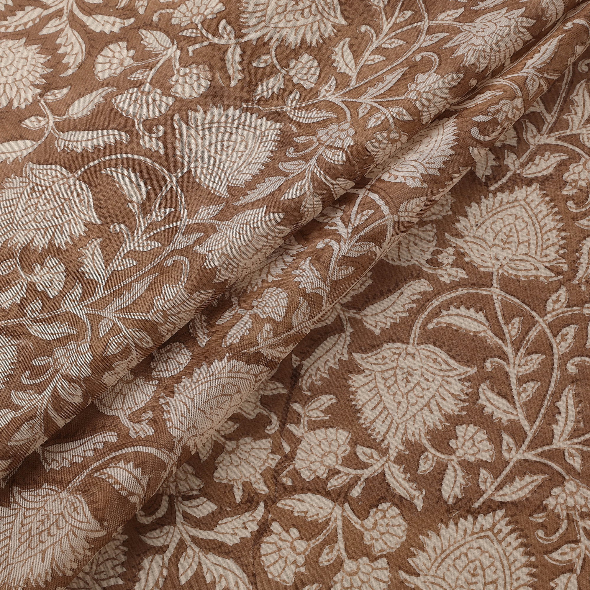 Brown hand block printed handloom chanderi silk cotton fabric from Rajasthan is crafted by skilled artisans and features delicate sanganeri motifs. Sanganeri hand block printing is a centuries-old technique, practiced for over 500 years, known for its fine detailing and graceful patterns. Dyed using bleed-free VAT colours, it is lightweight and elegant, making it ideal for creating thoughtful apparel or home decor. An easy way to infuse cultural charm into your everyday designs.