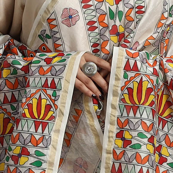 White - Handpainted Chanderi Silk Handloom Madhubani Dupatta 15