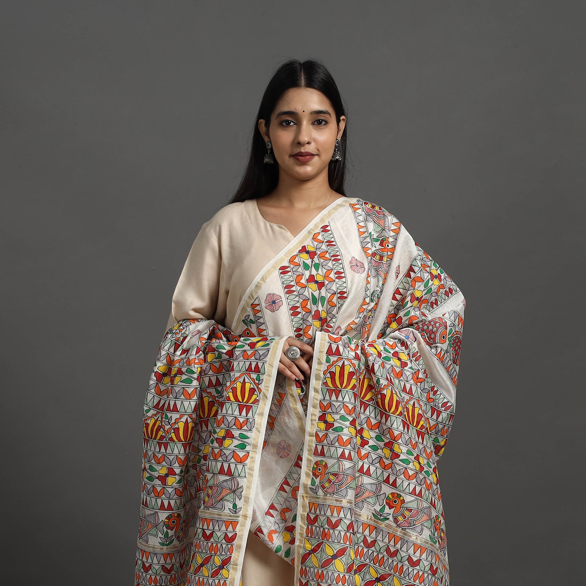 This multicolor handloom chanderi silk cotton handpainted madhubani dupatta with zari border showcases the traditional art of Mithila. Crafted by master artisans Hira Devi from Bihar, each piece features intricate patterns made with fabric colours, reflecting India’s rich cultural heritage. The luxurious silk-cotton blend offers a lightweight, elegant drape perfect for special occasions or elevating everyday wear.