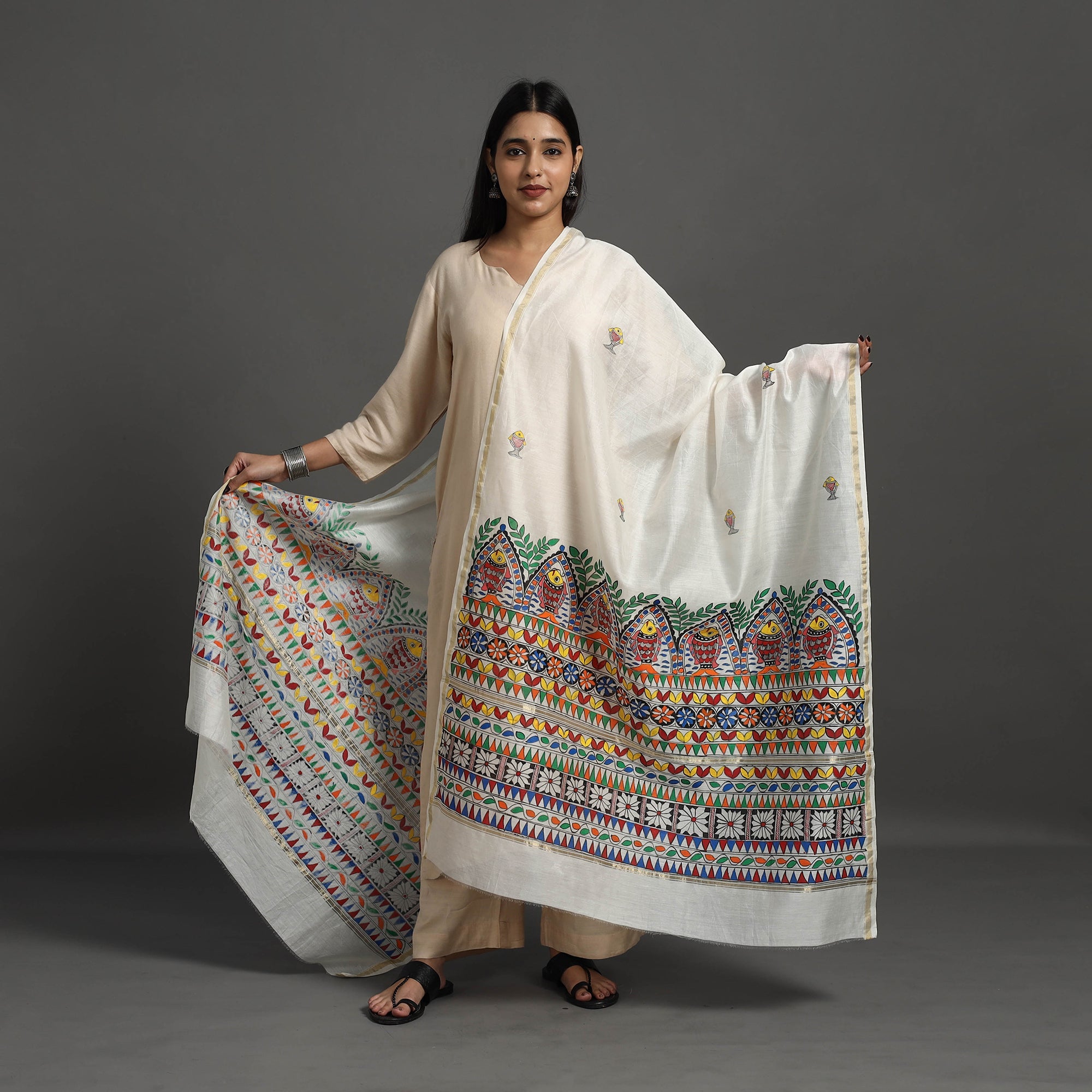 • White - Handloom Chanderi Silk Handpainted Madhubani Dupatta 29