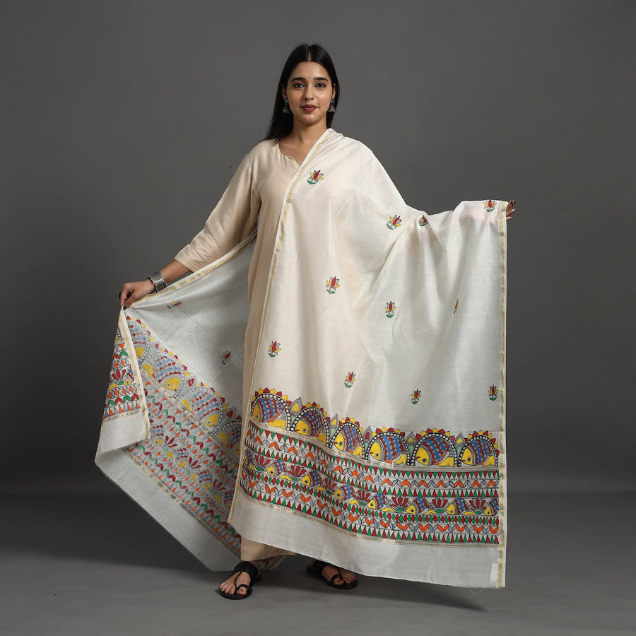 White - Handloom Chanderi Silk Handpainted Madhubani Dupatta 44
