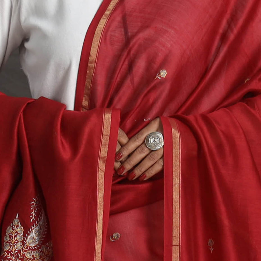 Experience the beauty of Kashmir with our red handloom Chanderi silk cotton Kashida embroidery dupatta, crafted by Zahoor Ahmed. Kashida embroidery is one of the most ancient and traditional types of craft. It is also known as ‘Kasida’. The embroidery is done with multi-colored threads. This delicate and traditional form of art is done by the young men of Kashmir. With an elegant zari border and lightweight texture, it’s perfect for any occasion. Embrace traditional craftsmanship and support local artisans.