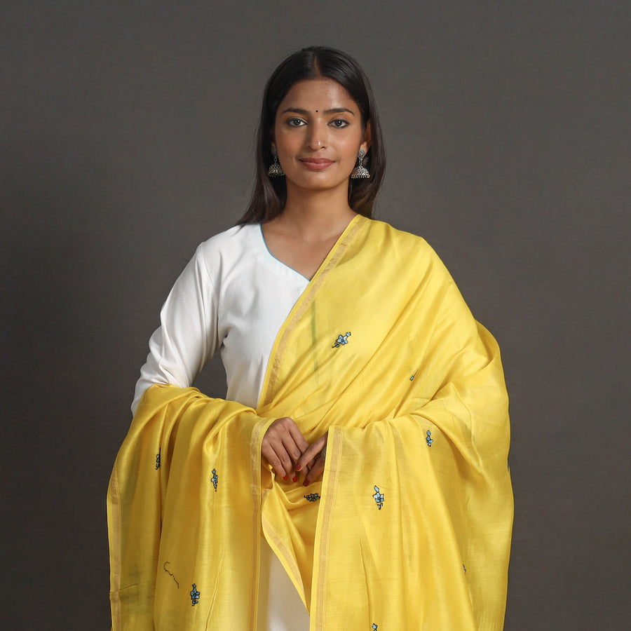Experience the beauty of Kashmir with our yellow handloom Chanderi silk cotton Kashida embroidery dupatta, crafted by Zahoor Ahmed. Kashida embroidery is one of the most ancient and traditional types of craft. It is also known as ‘Kasida’. The embroidery is done with multi-colored threads. This delicate and traditional form of art is done by the young men of Kashmir. With an elegant zari border and lightweight texture, it’s perfect for any occasion. Embrace traditional craftsmanship and support local artisans.