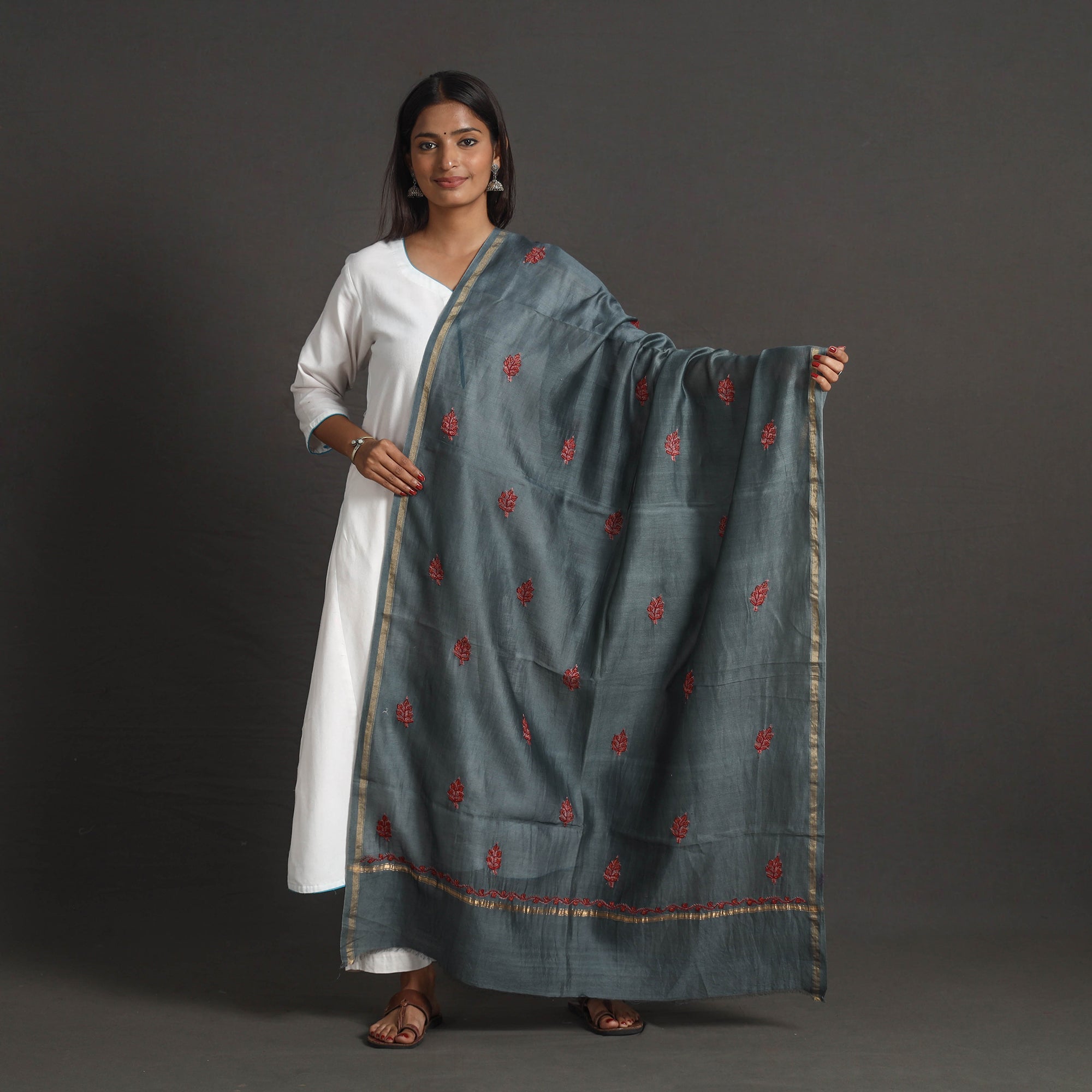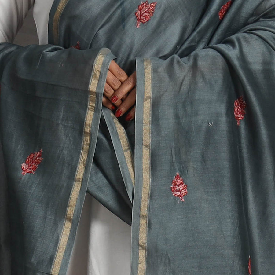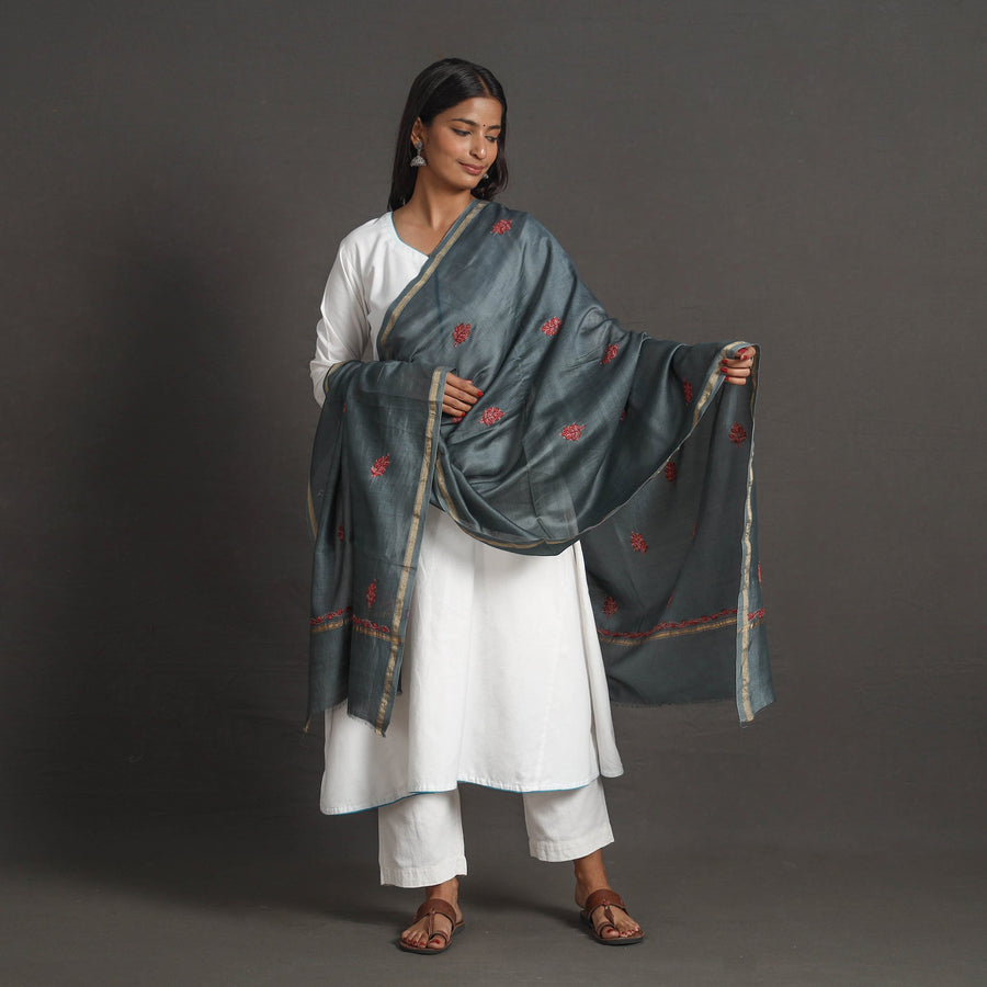 Experience the beauty of Kashmir with our grey handloom Chanderi silk cotton Kashida embroidery dupatta, crafted by Zahoor Ahmed. Kashida embroidery is one of the most ancient and traditional types of craft. It is also known as ‘Kasida’. The embroidery is done with multi-colored threads. This delicate and traditional form of art is done by the young men of Kashmir. With an elegant zari border and lightweight texture, it’s perfect for any occasion. Embrace traditional craftsmanship and support local artisans.