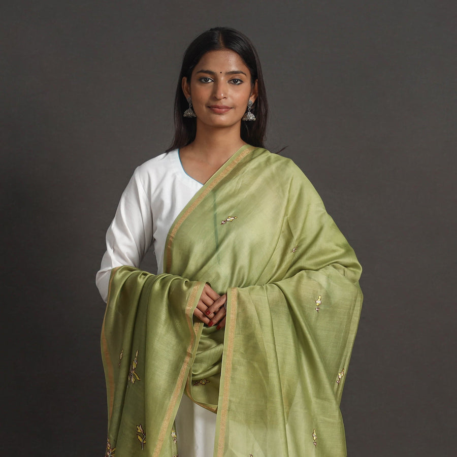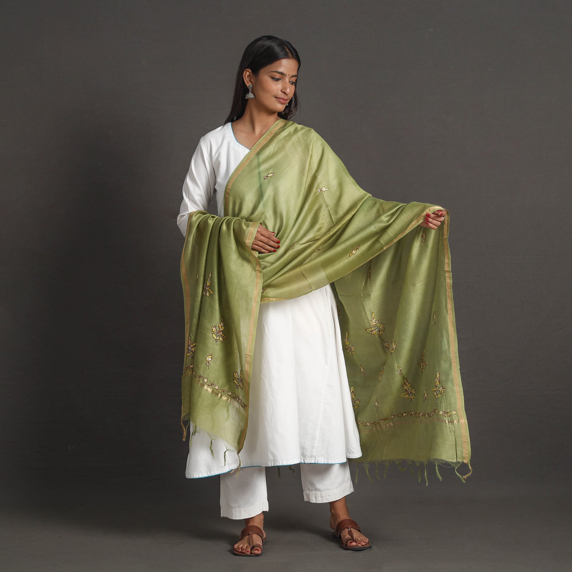 Experience the beauty of Kashmir with our green handloom Chanderi silk cotton Kashida embroidery dupatta, crafted by Zahoor Ahmed. Kashida embroidery is one of the most ancient and traditional types of craft. It is also known as ‘Kasida’. The embroidery is done with multi-colored threads. This delicate and traditional form of art is done by the young men of Kashmir. With an elegant zari border and lightweight texture, it’s perfect for any occasion. Embrace traditional craftsmanship and support local artisans.
