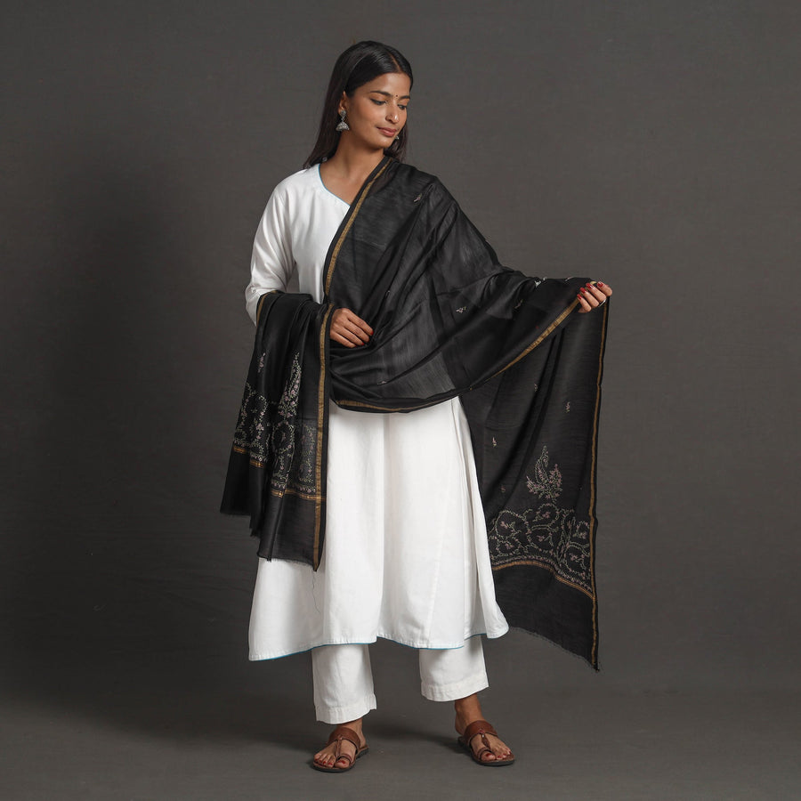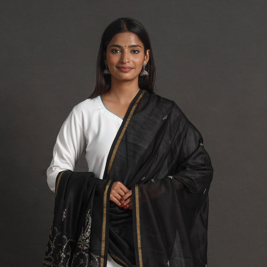 Experience the beauty of Kashmir with our black handloom Chanderi silk cotton Kashida embroidery dupatta, crafted by Zahoor Ahmed. Kashida embroidery is one of the most ancient and traditional types of craft. It is also known as ‘Kasida’. The embroidery is done with multi-colored threads. This delicate and traditional form of art is done by the young men of Kashmir. With an elegant zari border and lightweight texture, it’s perfect for any occasion. Embrace traditional craftsmanship and support local artisans.