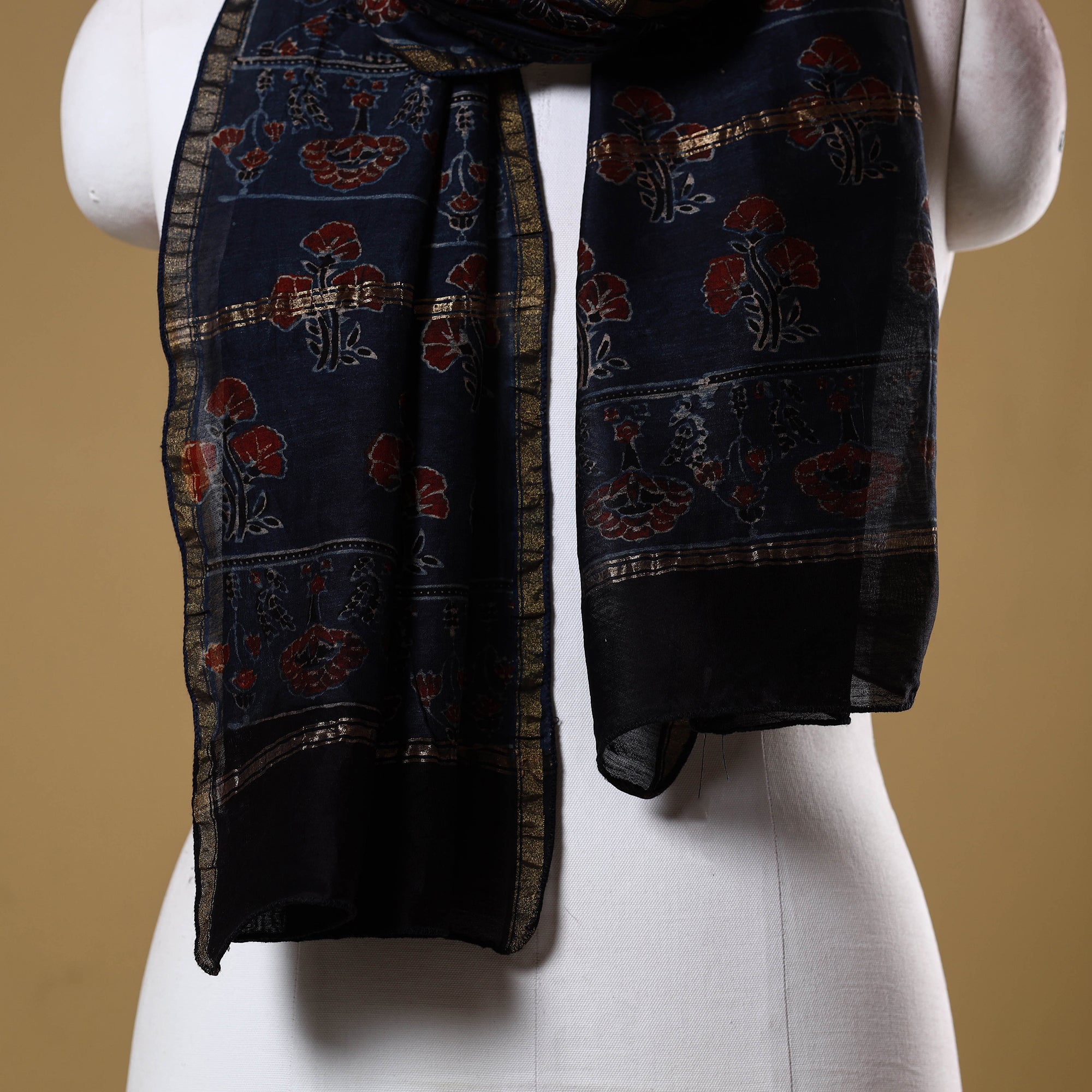 | Material | Blue pure handloom chanderi silk cotton ajrakh stole is hand block printed using natural dyes by artisans from Kutch. It features traditional geometric patterns and bold colours, enhanced with a subtle zari border. Lightweight and breathable, it pairs perfectly with both ethnic and everyday wear, adding elegance to any look. A Note on Handmade Beauty : |