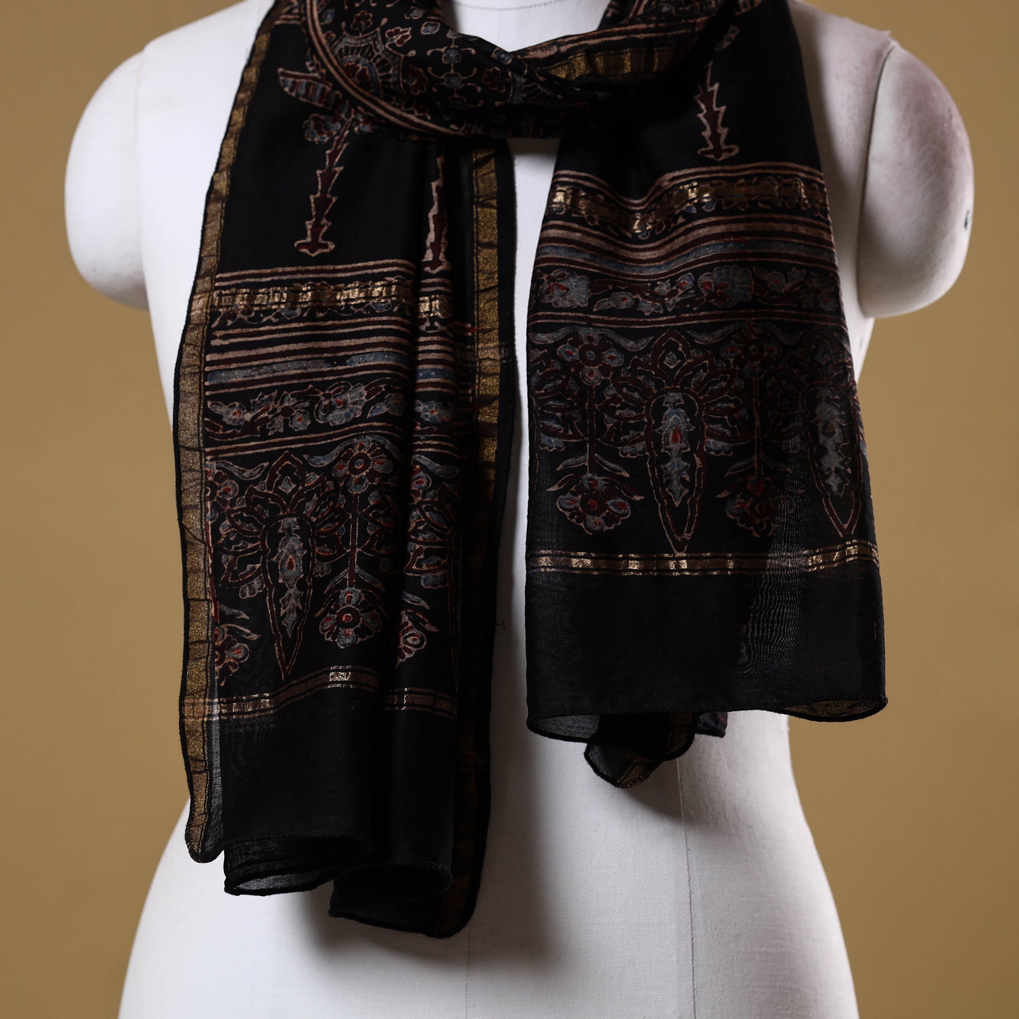 Black pure handloom chanderi silk cotton ajrakh stole is hand block printed using natural dyes by artisans from Kutch. It features traditional geometric patterns and bold colours, enhanced with a subtle zari border. Lightweight and breathable, it pairs perfectly with both ethnic and everyday wear, adding elegance to any look.