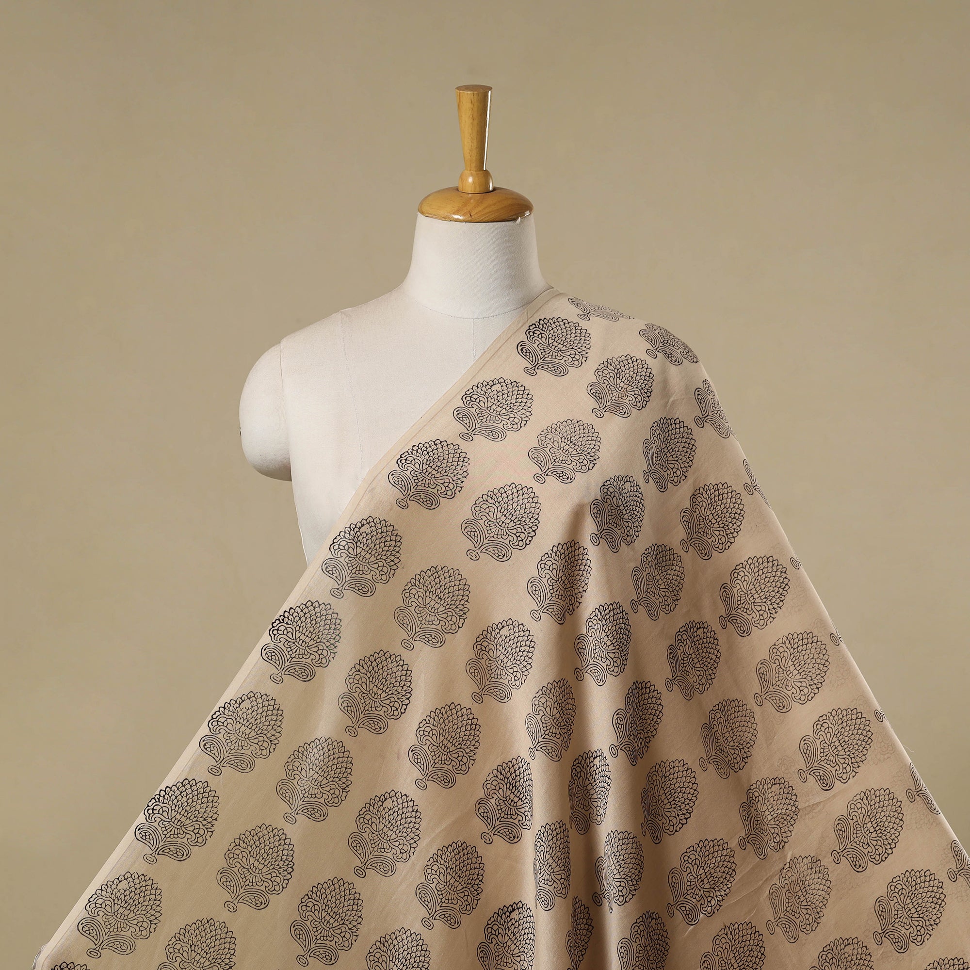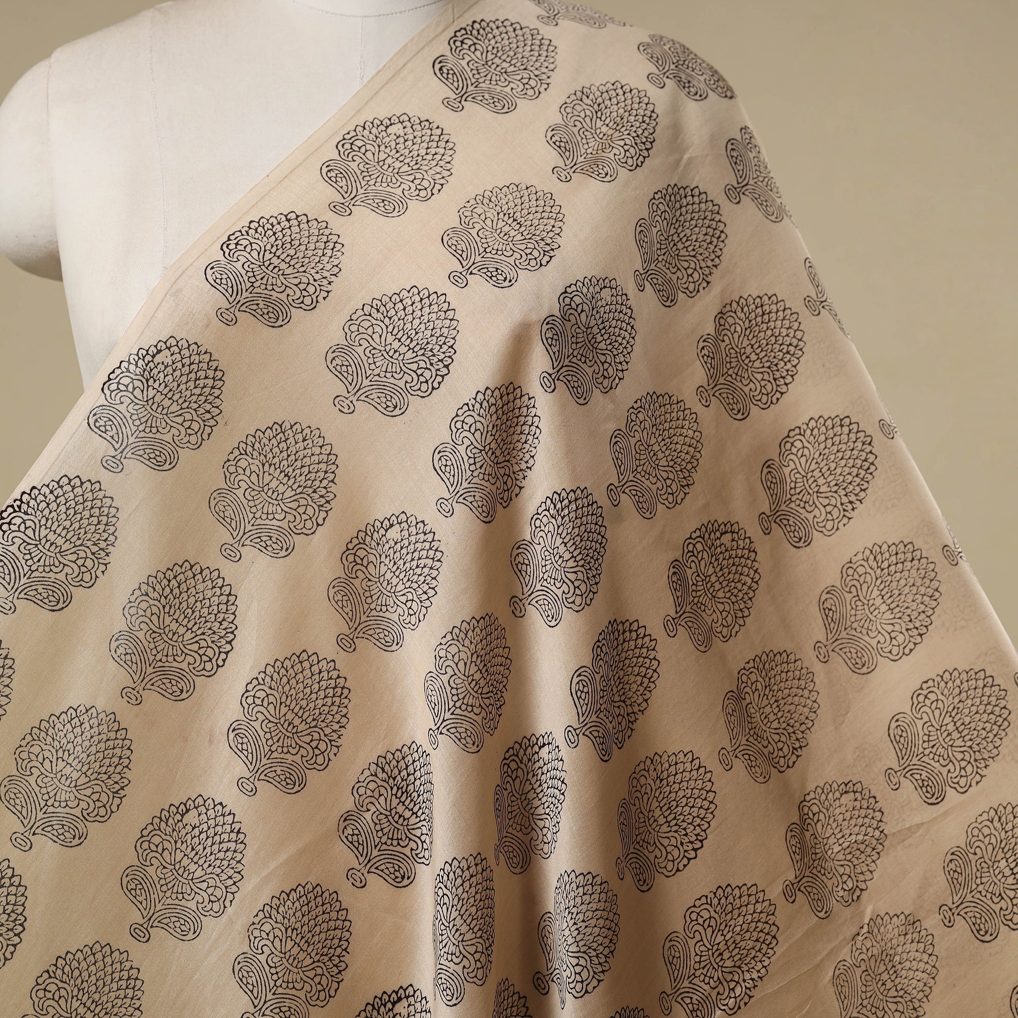 Beige handloom bagh fabric is hand block printed by master artisan Umar Faruq Khatri from Madhya Pradesh. Crafted using natural dyes and traditional techniques, it features geometric motifs on chanderi silk. Each design is carefully created using wooden blocks, making it perfect for clothing, home decor or creative projects.