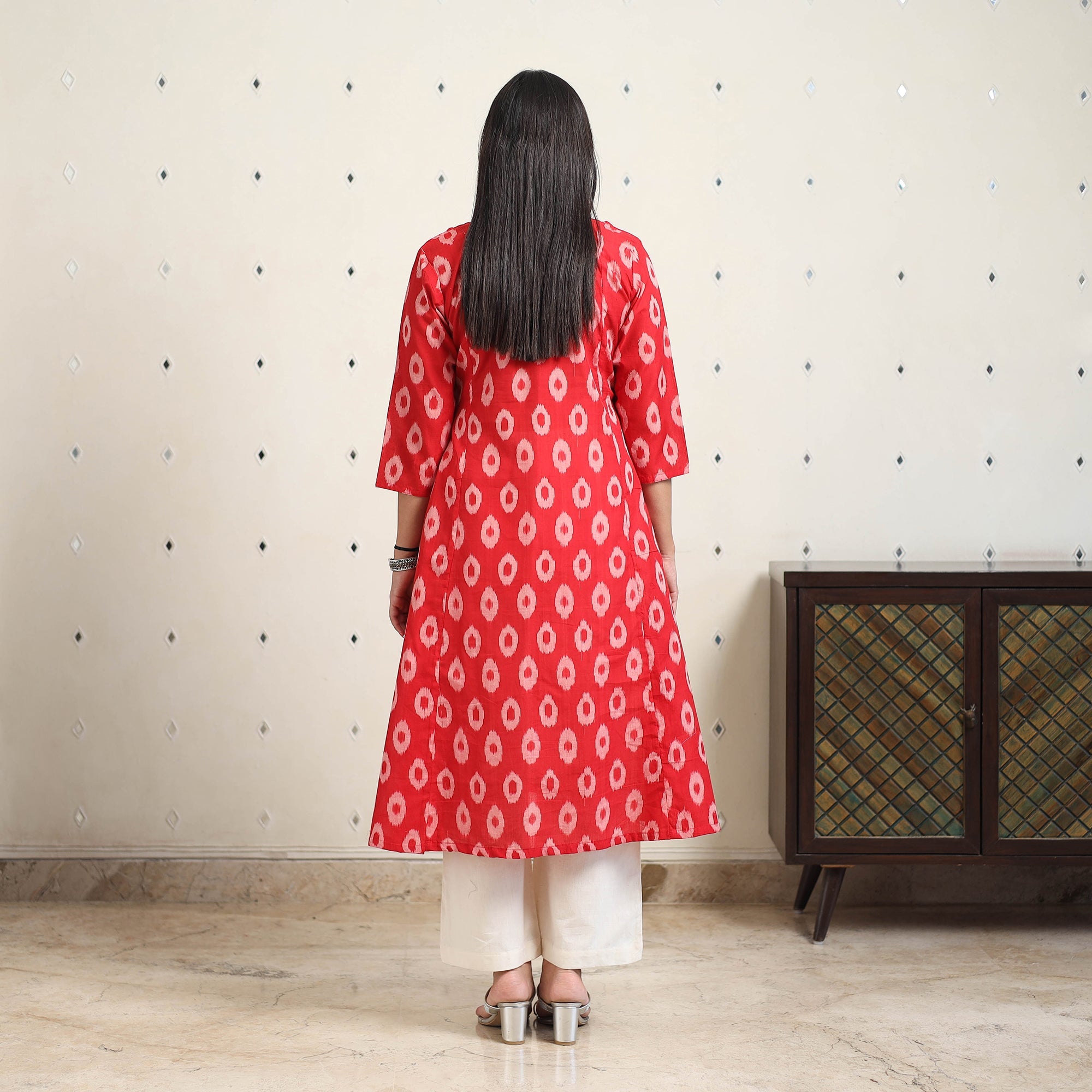 This red mercerized cotton pochampally double Ikat kurta showcases the traditional weaving craft of Telangana. It features a comfortable A-line fit with a side pocket. The Ikat technique, where yarns are resist-dyed before weaving, creates beautiful patterns. Ideal for everyday wear, office, casual outings, or relaxed gatherings.
