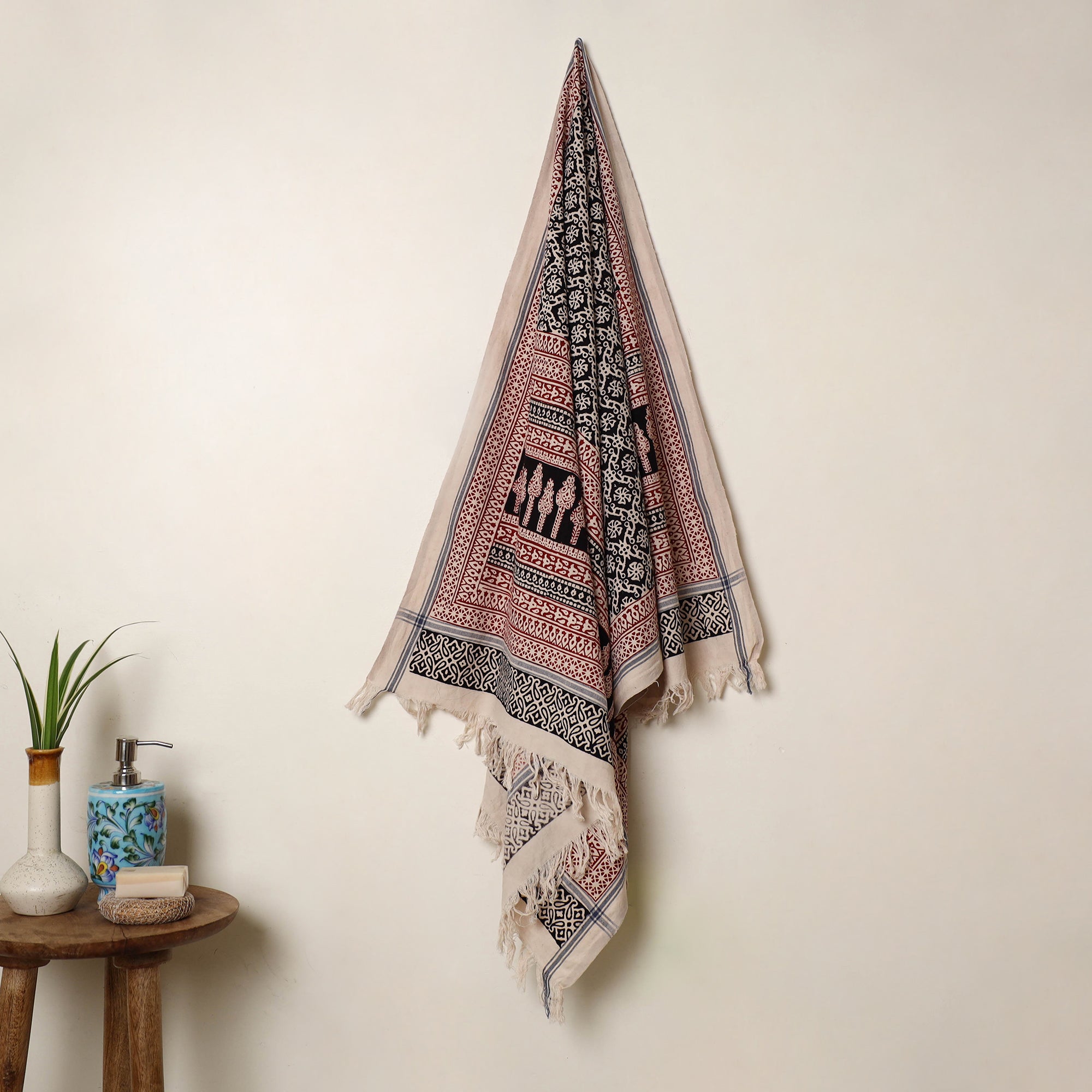 Wrap yourself in the charm of age-old craftsmanship with this black bagh print cotton towel, meticulously created by skilled artisans in Madhya Pradesh. Adorned with intricate patterns and natural dyed with traditional methods, it seamlessly blends artistry with functionality. Soft, highly absorbent, and lightweight, it is an excellent choice for daily use.