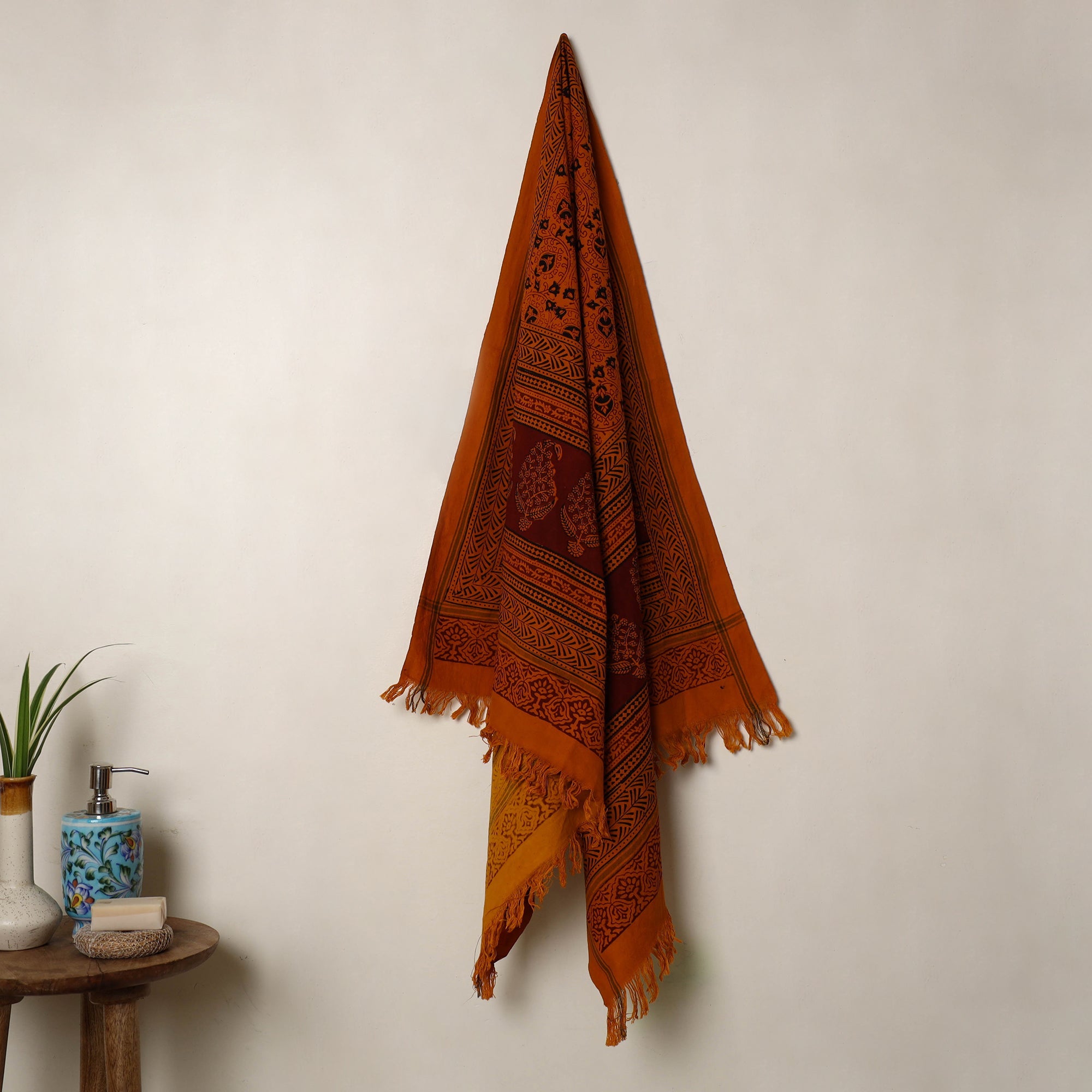 Wrap yourself in the charm of age-old craftsmanship with this orange bagh print cotton towel, meticulously created by skilled artisans in Madhya Pradesh. Adorned with intricate patterns and natural dyed with traditional methods, it seamlessly blends artistry with functionality. Soft, highly absorbent, and lightweight, it is an excellent choice for daily use.