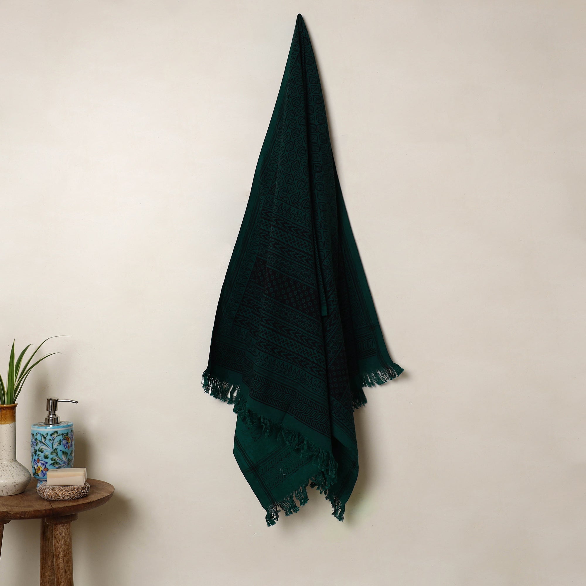 Wrap yourself in the charm of age-old craftsmanship with this green bagh print cotton towel, meticulously created by skilled artisans in Madhya Pradesh. Adorned with intricate patterns and natural dyed with traditional methods, it seamlessly blends artistry with functionality. Soft, highly absorbent, and lightweight, it is an excellent choice for daily use.