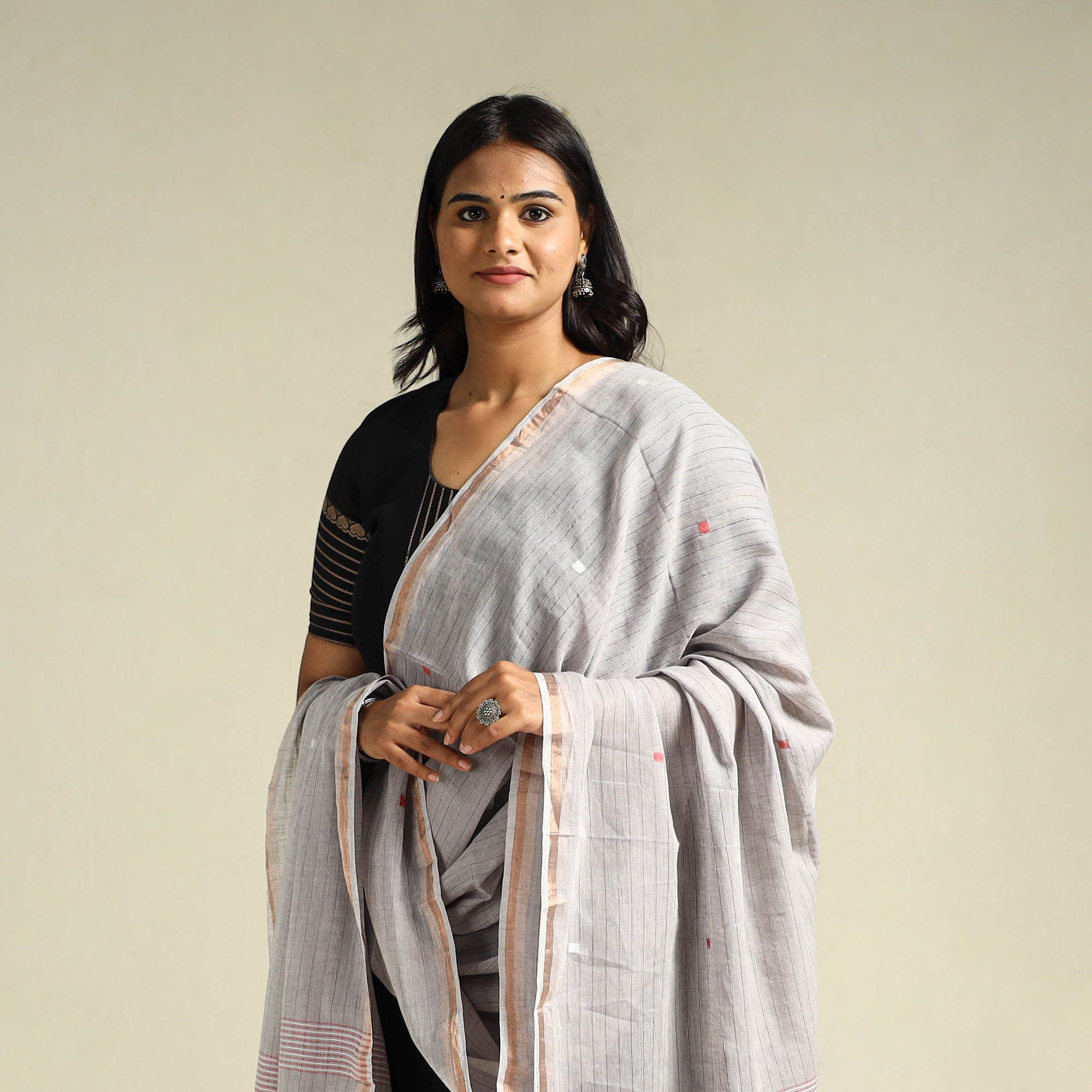 This white handloom cotton jamdani dupatta with tassels is crafted by the skilled artisans of Bengal. Jamdani’s extra-weft weaving technique, creates delicate embroidery-like motifs directly on the loom. Using tiny shuttles of colored threads passed through the warp, the weaving forms patterns that resemble intricate tapestry work. A beautiful blend of heritage and charm, this lightweight dupatta is perfect for both festive occasions and everyday elegance.